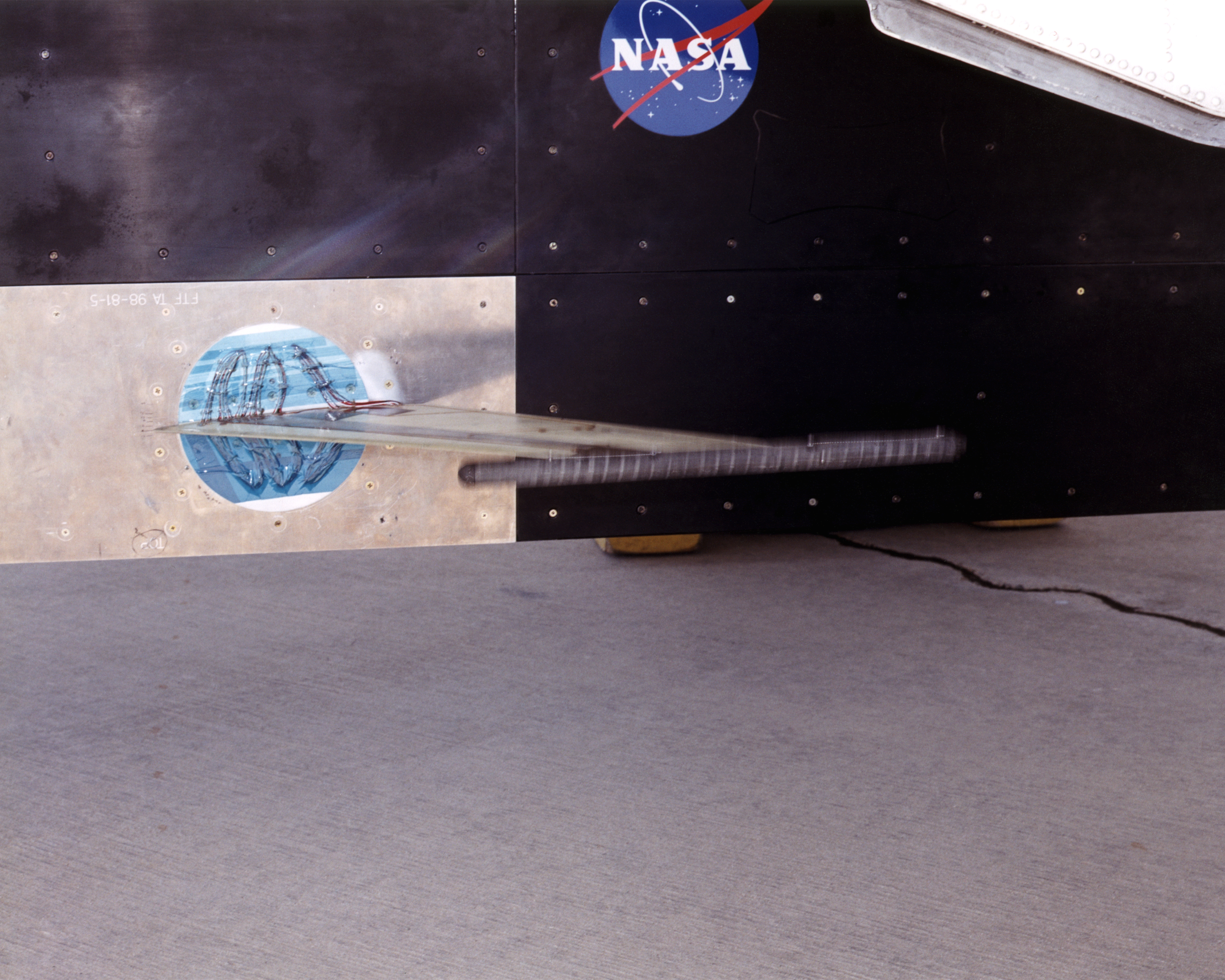 The Aerostructures Test Wing (ATW) experiment, which consisted of an 18-inch carbon fiber test wing with surface-mounted piezoelectric strain actuators, undergoing ground testing prior to flight on Dryden's F-15B Research Testbed aircraft