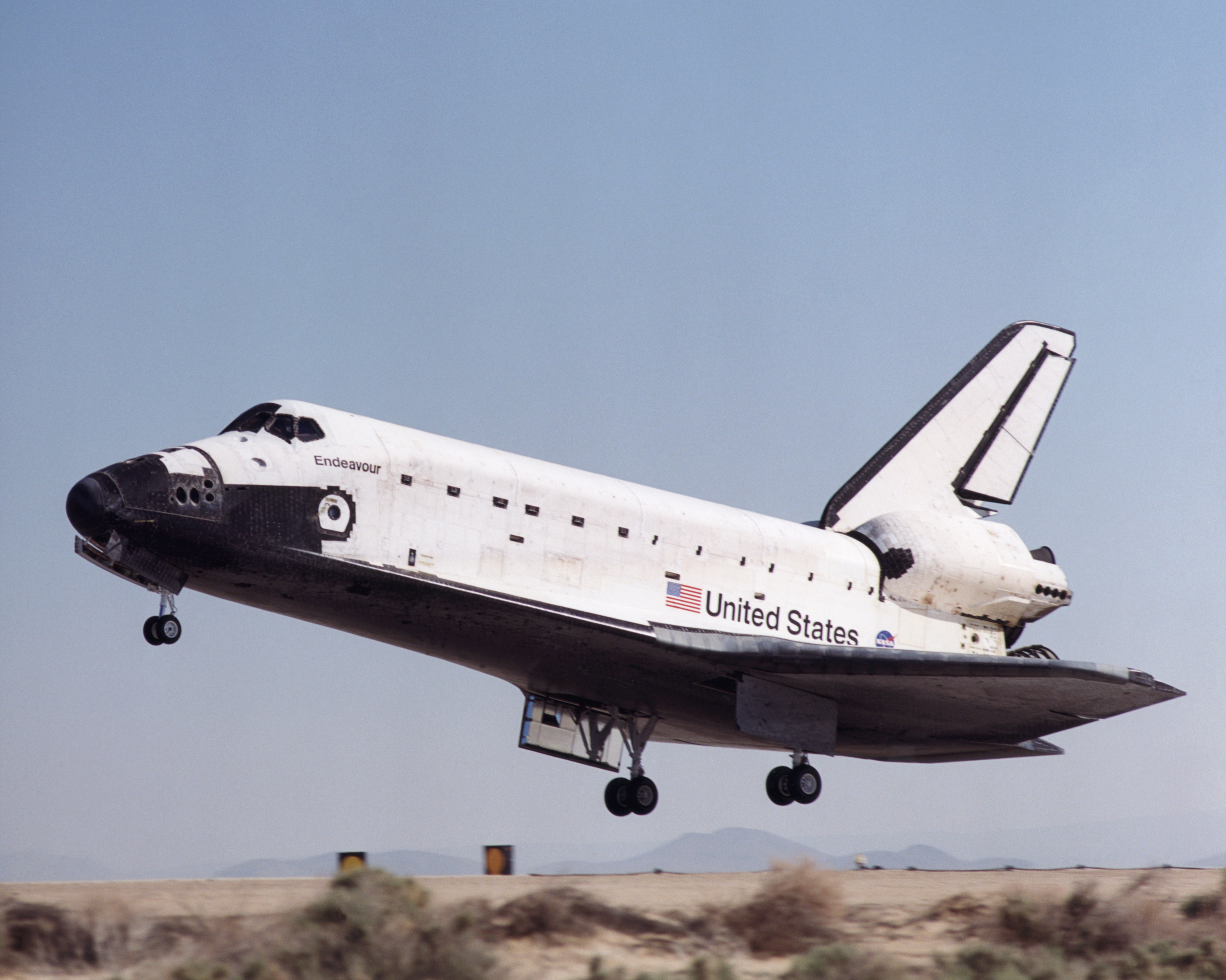A long telephoto lens captured Space Shuttle Endeavour landing at Edwards Air Force Base, California, on May 1, 2001