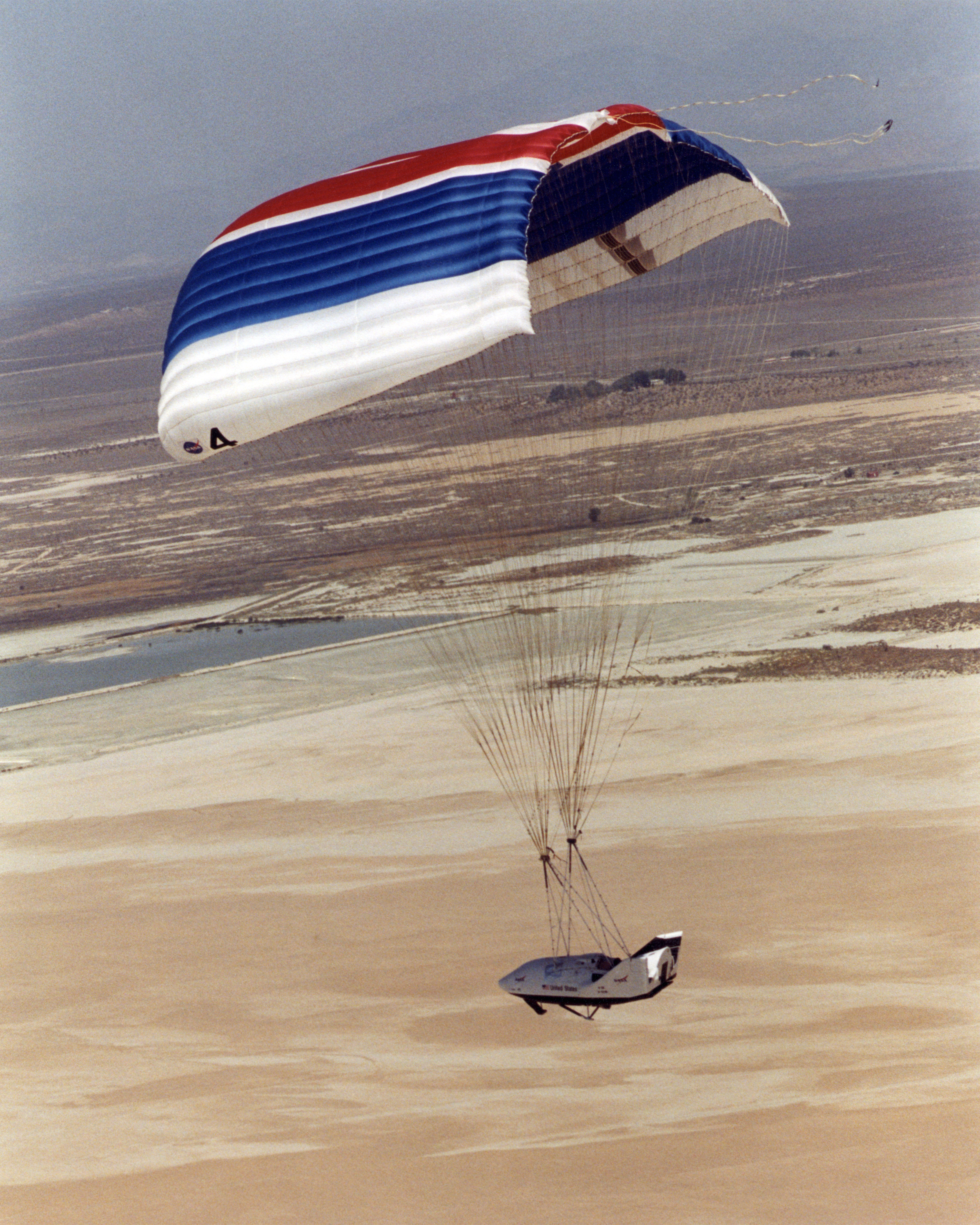 The X-38 prototype of the Crew Return Vehicle is suspended under its giant 7,500-square-foot parafoil during its eighth free flight on Thursday, December 13, 2001
