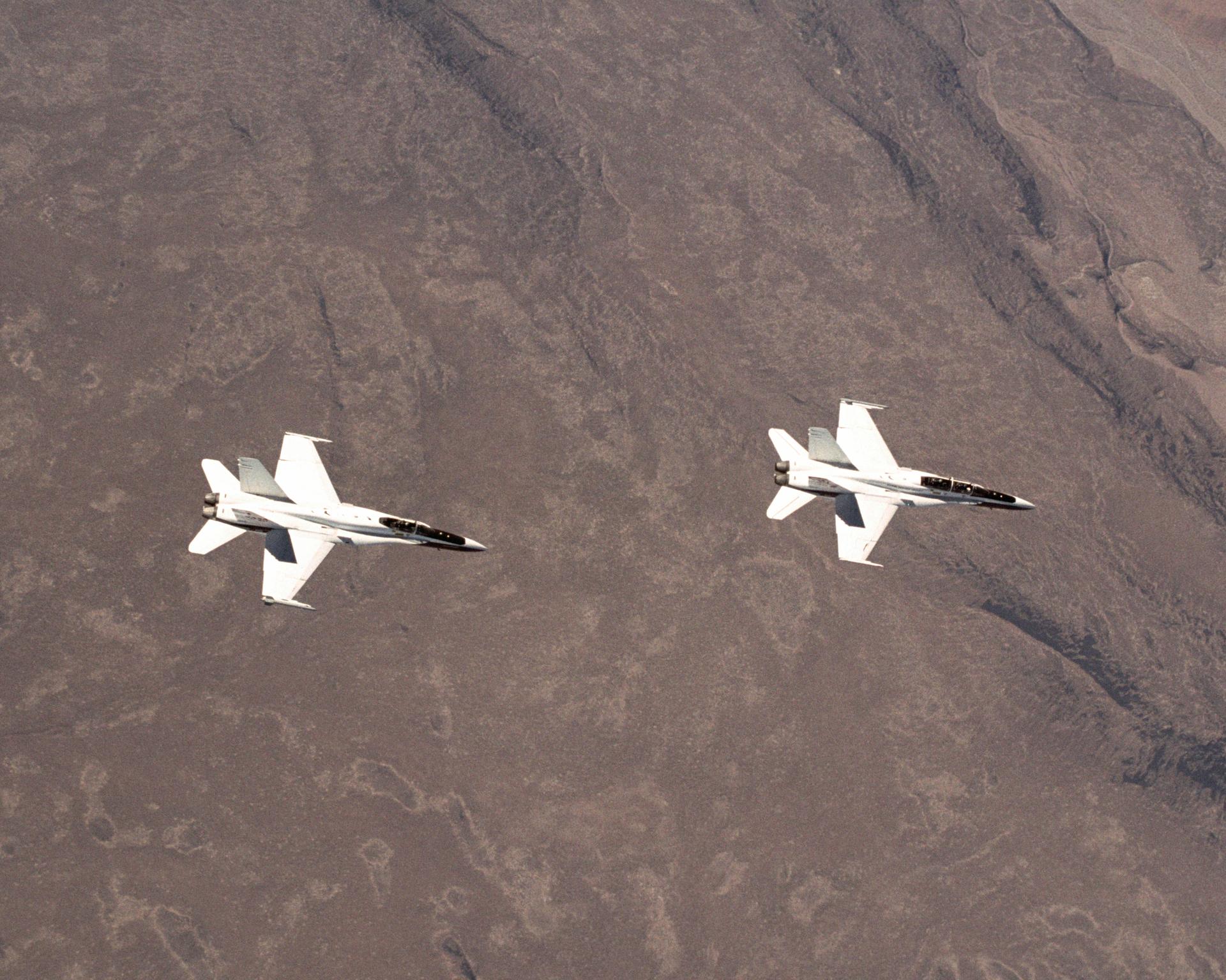 These two NASA F/A-18 aircraft are flying a test point for the Autonomous Formation Flight project over California's Mojave Desert.