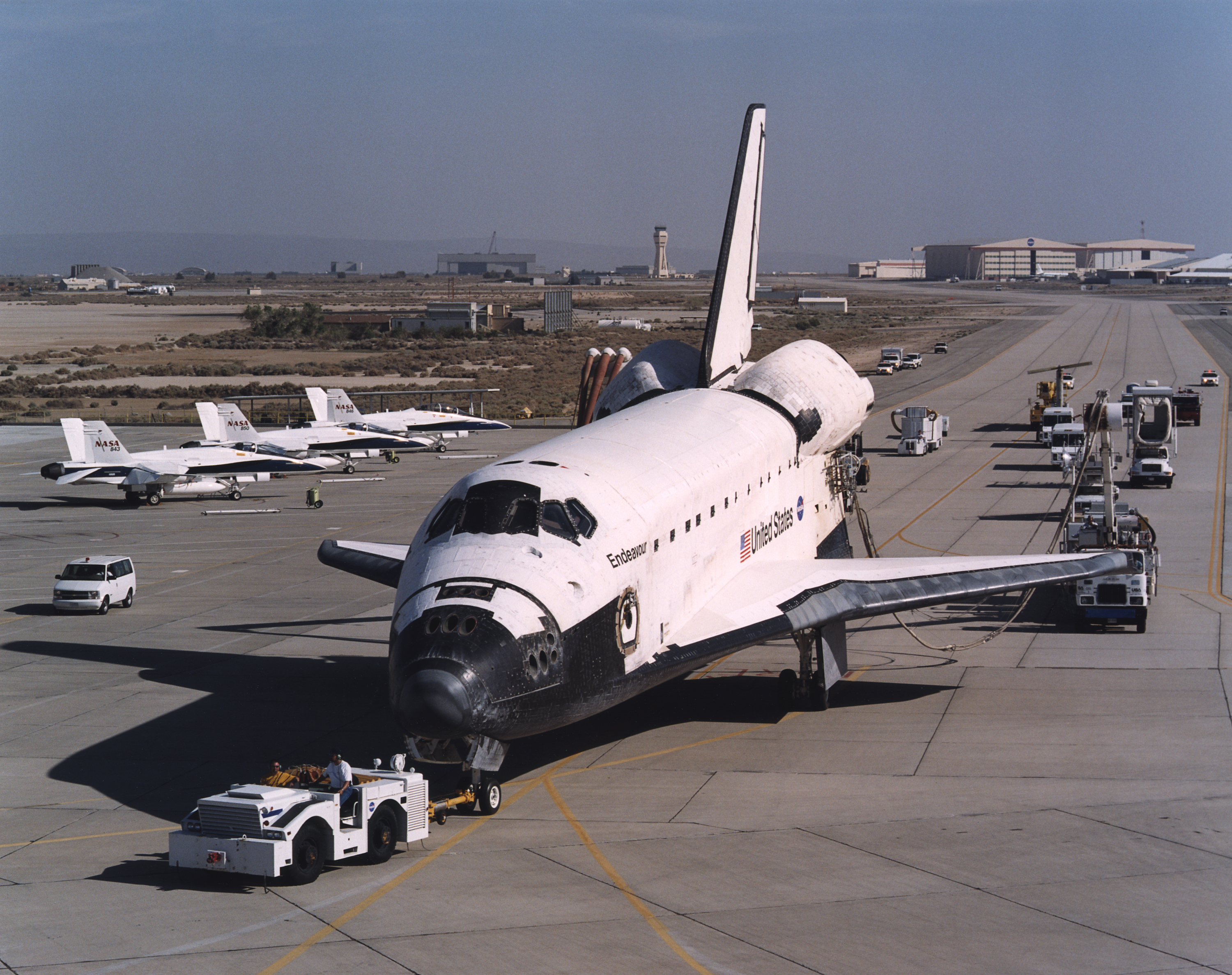 The Space Shuttle Endeavour, accompanied by a convoy of recovery vehicles, is towed up the taxiway at NASA's Dryden Flight Research Center at Edwards Air Force Base, California, following its landing on June 19, 2002. The landing, the 49th to occur at Edwards, concluded mission STS-111 to the International Space Station. It was the 18th orbital mission of Endeavour and the 110th space shuttle mission overall.