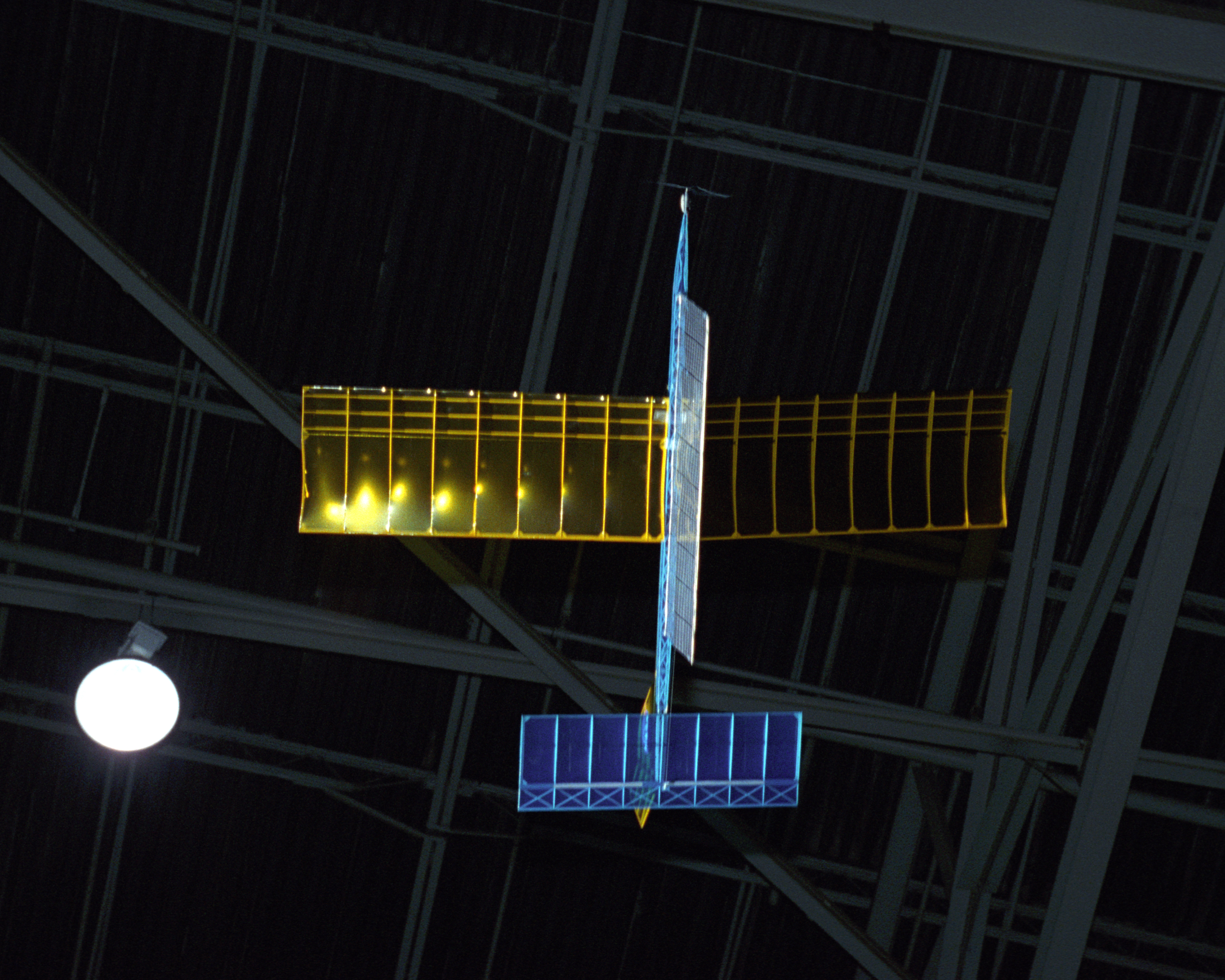 An experimental radio-controlled model aircraft casts two unique shadows as it flies inside a Dryden hangar using two spotlights as energy sources.