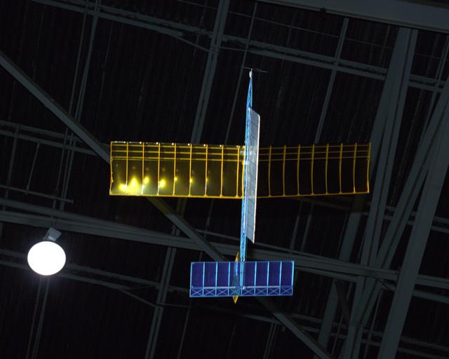 An experimental radio-controlled model aircraft casts a unique shadow as it flies inside a Dryden hangar using only a spotlight as an energy source.