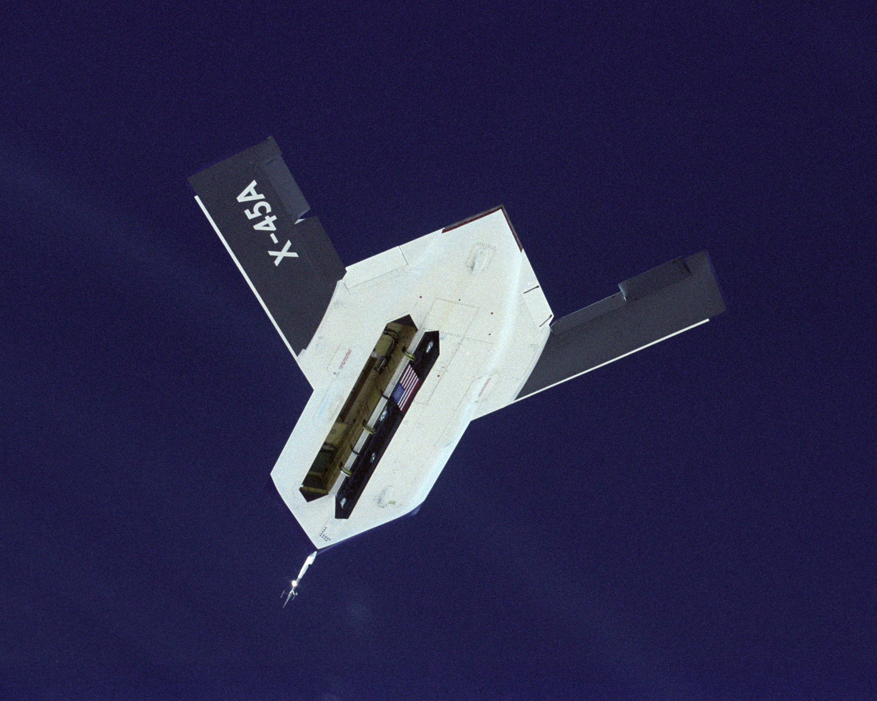 The DARPA/U.S. Air Force X-45A Unmanned Combat Air Vehicle (UCAV) system demonstration program completed the first phase of demonstrations, known as Block I, on Feb. 28, 2003. The final Block I activities included two flights at Dryden, during which safe operation of the weapons bay door was verified at 35,000 feet and speeds of Mach 0.75, the maximum planned altitude and speed for the two X-45A demonstrator vehicles.