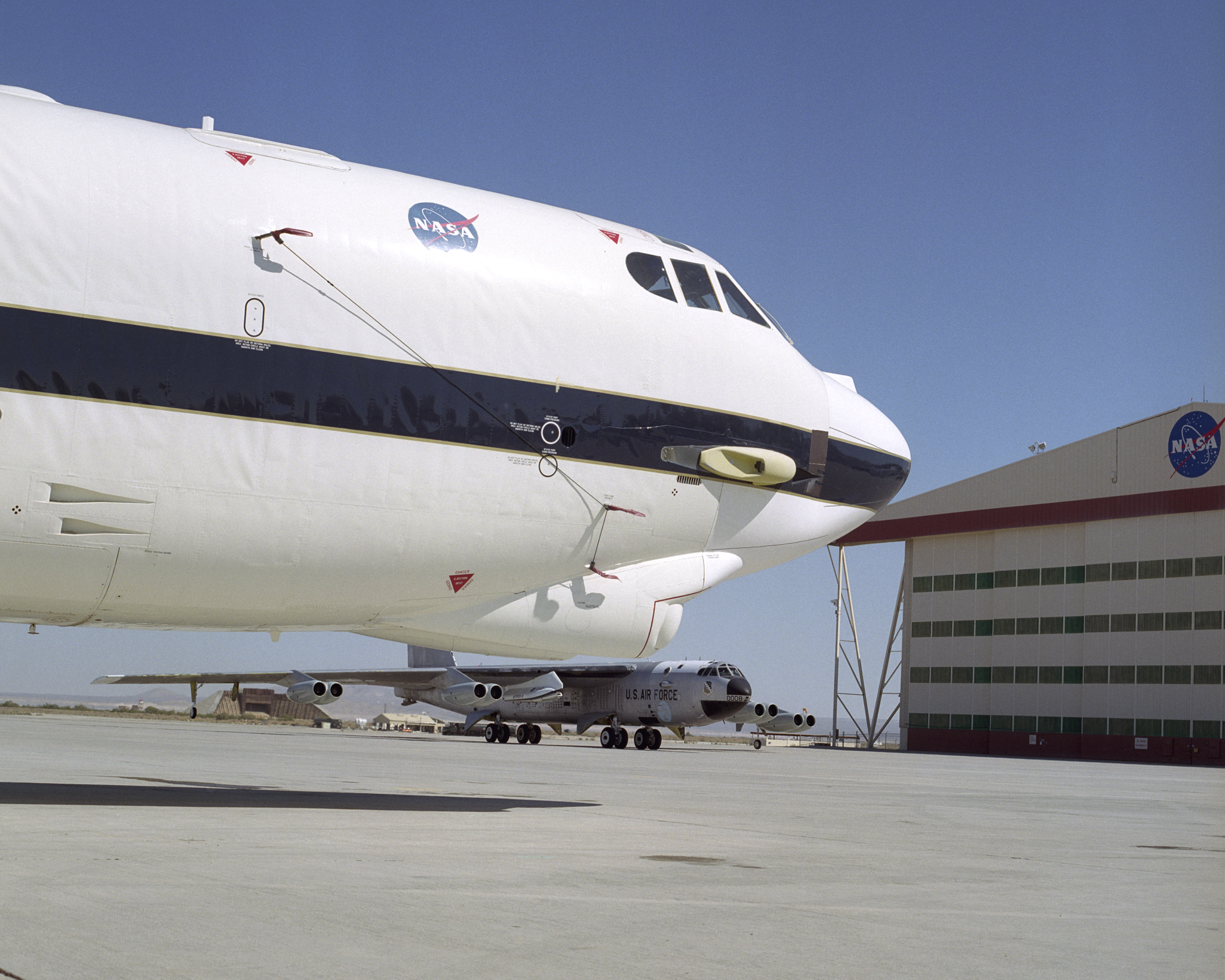 Ready to go, NASA's new B-52H mother ship waits as NASA B-52B 008 taxis back from flight.