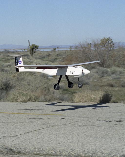 One of two small APV-3 aircraft flown in the joint Ames-Dryden Networked UAV Teaming Experiment flares for landing on a roadway on a remote area of Edwards AFB.
