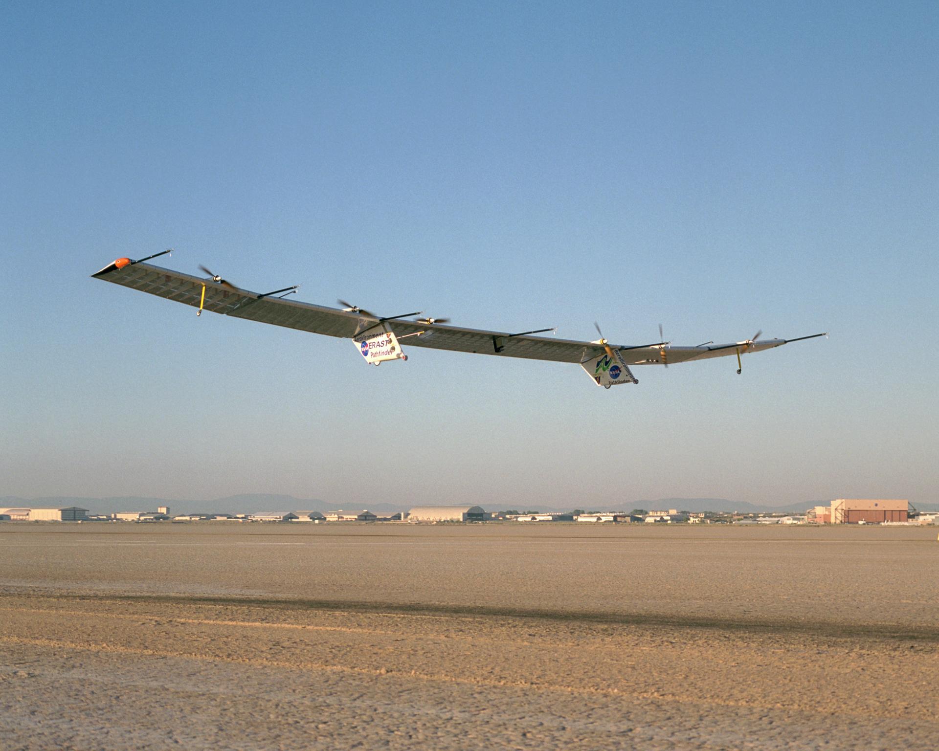 With turbulence-measurement booms projecting ahead of the wing, Pathfinder-Plus soars aloft over Rogers Dry Lake on its final research flight from NASA Dryden.