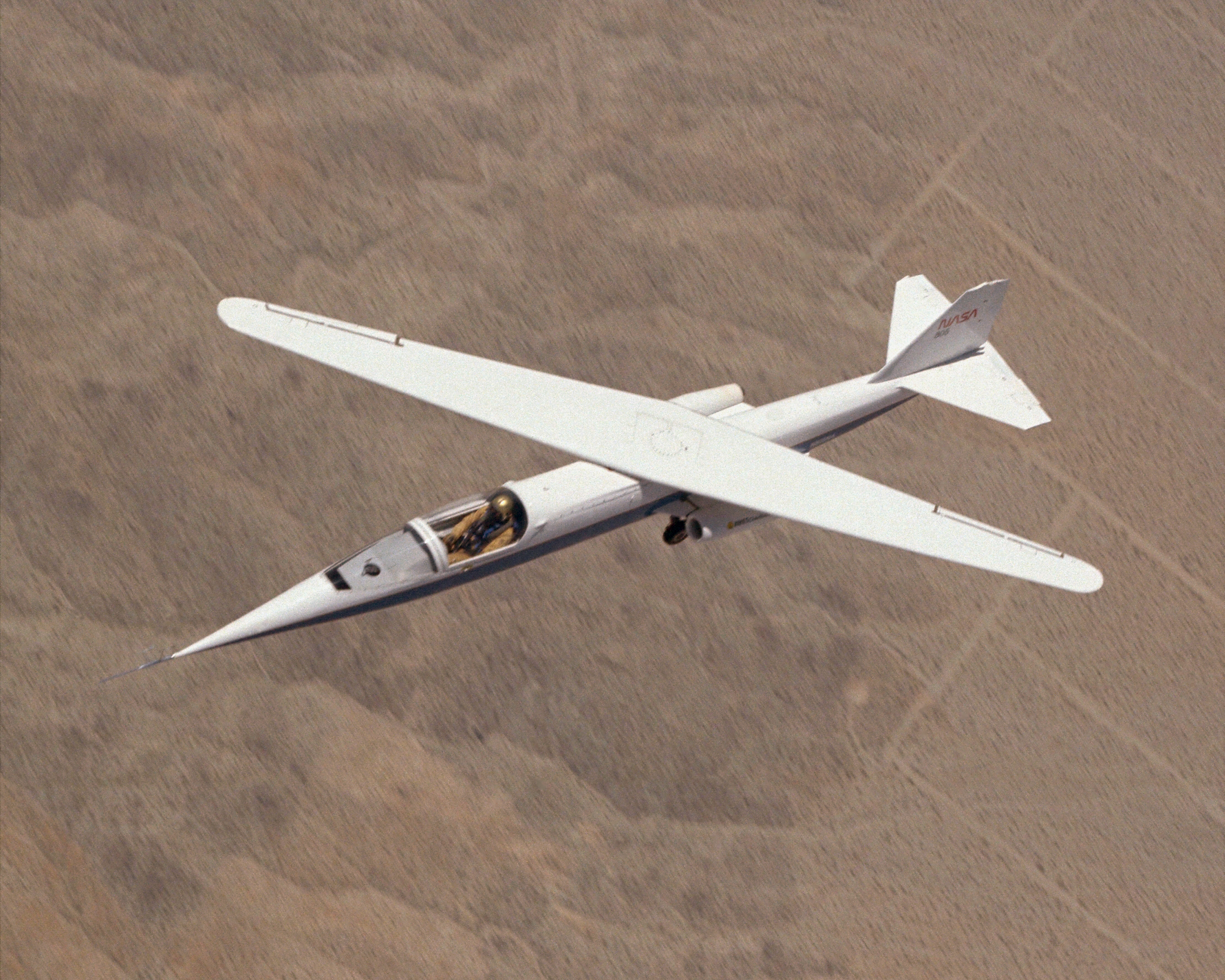 AD-1 in flight. Flight #30. The AD-1 aircraft in flight with its wing swept at 60 degrees, the maximum sweep angle.