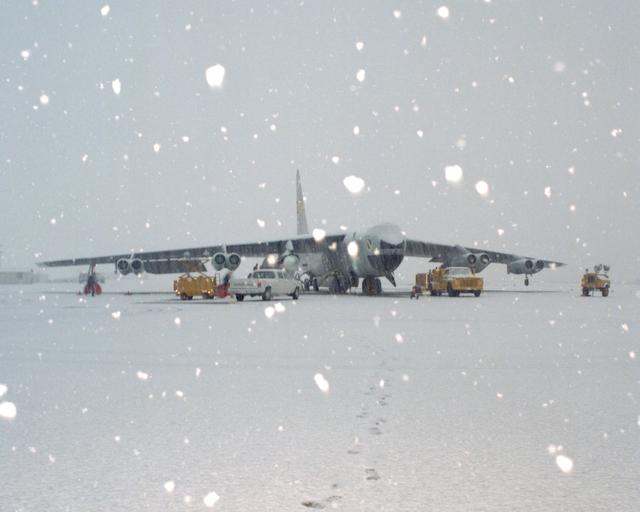 Space Shuttle Solid Rocket Booster Drop Test Vehicle (SRB-DTV) mated to NB-52B in snow