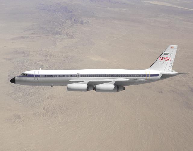 NASA 710, a Convair 990 transport aircraft formerly used for medium altitude atmospheric research, cruises over the Mojave Desert near NASA's Dryden Flight Research Center, Edwards, California. The flight was a final speed calibration run prior to the start of extensive modifications that turned the aircraft into a landing systems research aircraft to test and evaluate brakes and landing gear systems on space shuttles and also conventional aircraft. Research flights with the aircraft began in April of 1993. Testing of shuttle components lasted into fiscal year 1995.