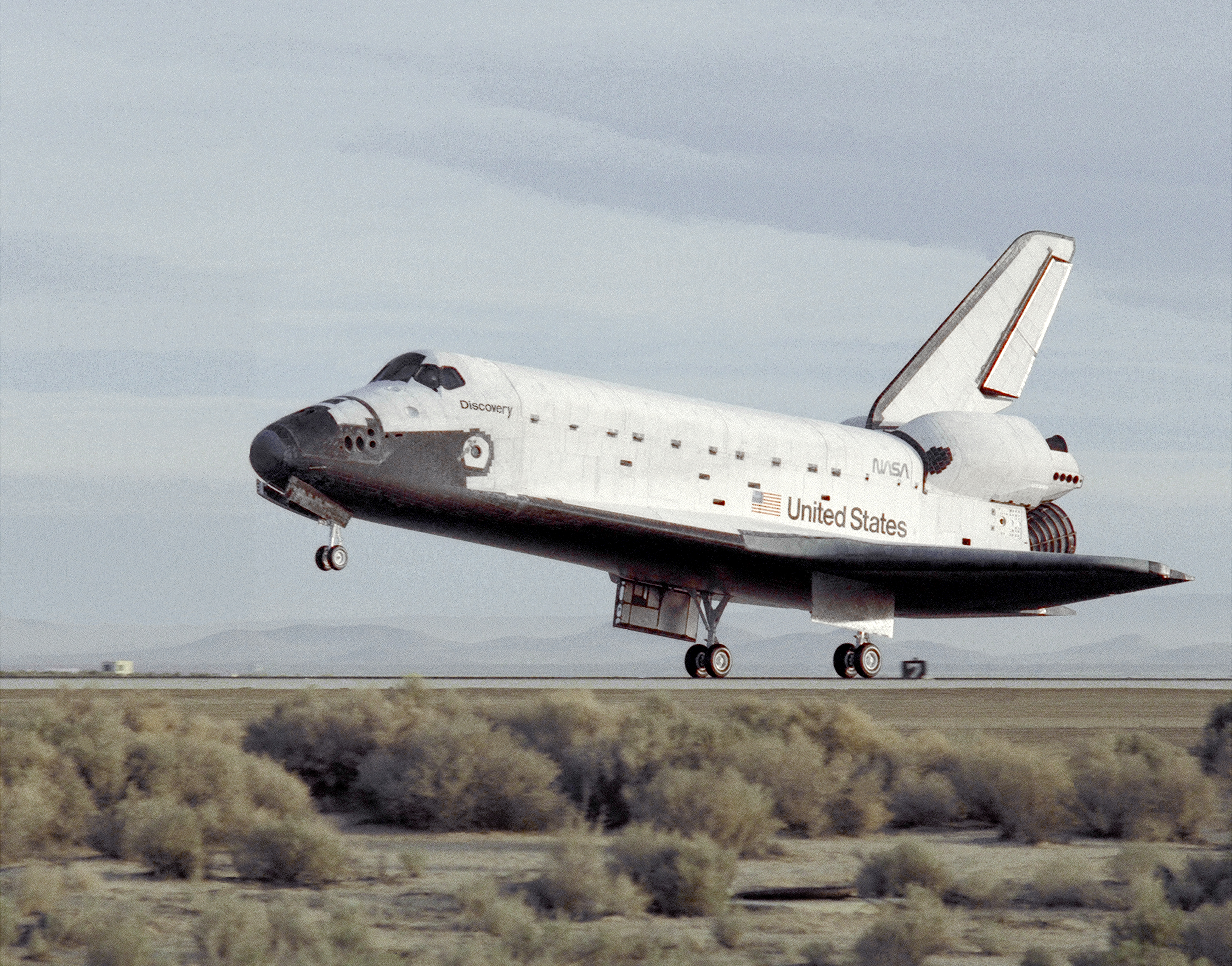 The STS-29 Space Shuttle Discovery mission lands at NASA's then Ames-Dryden Flight Research Facility, Edwards AFB, California, early Saturday morning, 18 March 1989. Touchdown was at 6:35:49 a.m. PST and wheel stop was at 6:36:40 a.m. on runway 22. Controllers chose the concrete runway for the landing in order to make tests of braking and nosewheel steering. The STS-29 mission was very successful, completing the launch of a Tracking and Data Relay communications satellite, as well as a range of scientific experiments. Discovery's five-man crew was led by Commander Michael L. Coats, and included pilot John E. Blaha and mission specialists James P. Bagian, Robert C. Springer, and James F. Buchli.
