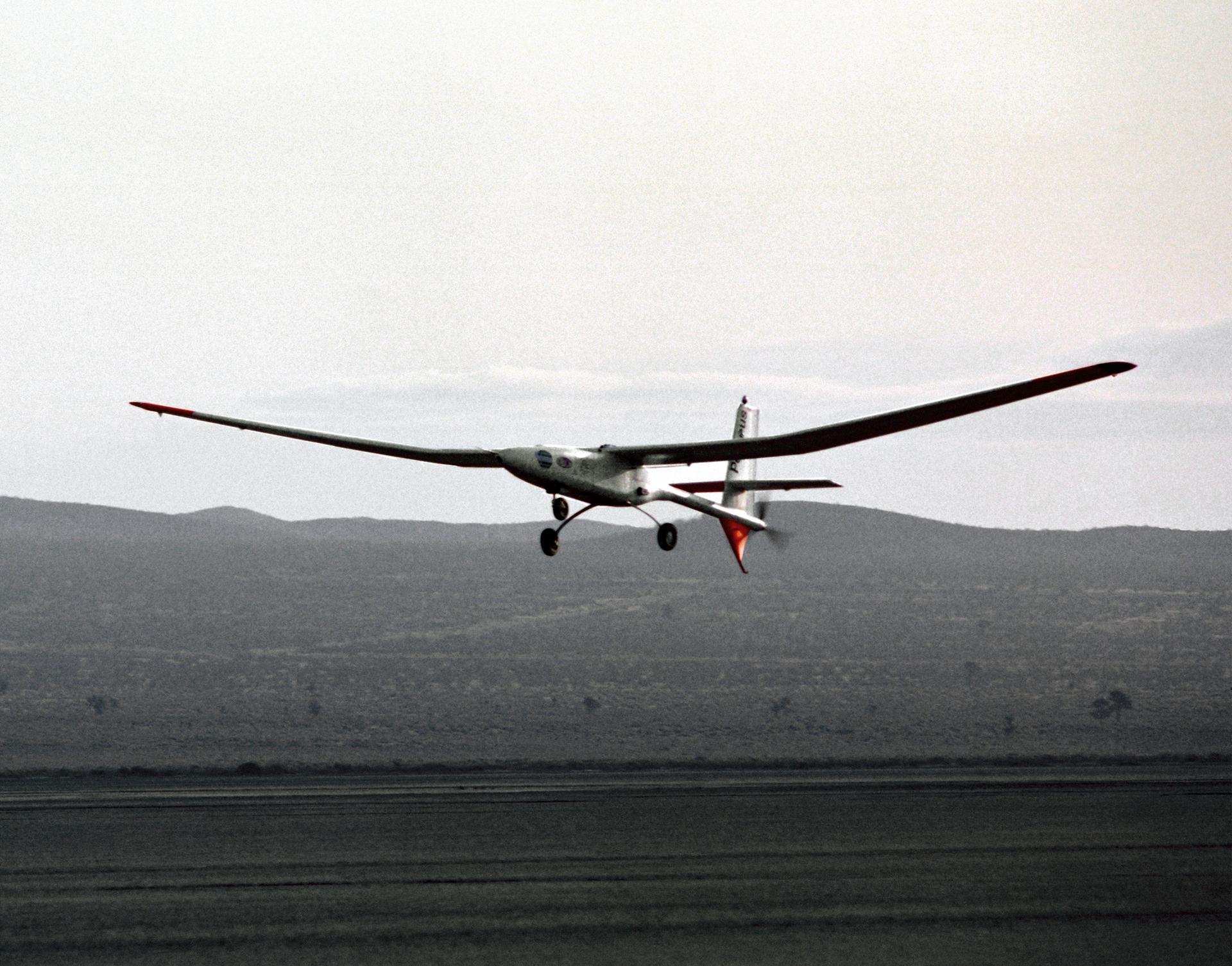 The Perseus proof-of-concept vehicle flies over Rogers Dry Lake at the Dryden Flight Research Center, Edwards, California, to test basic design concepts for the remotely-piloted, high-altitude vehicle.