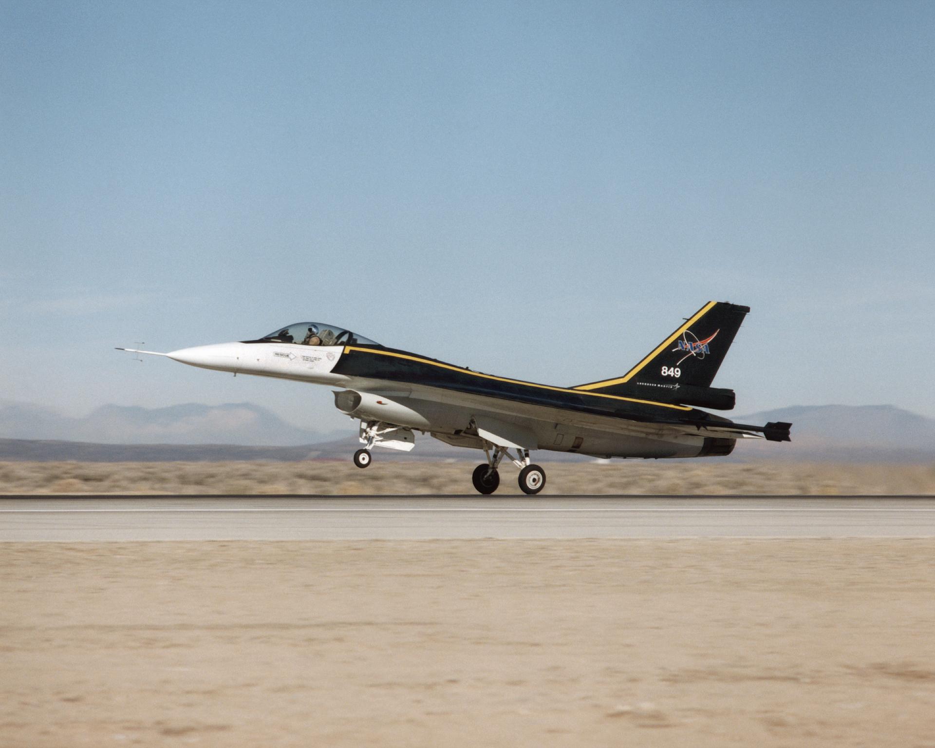 The F-16XL #1 (NASA 849) takes off for the first flight of the Digital Flight Control System (DFCS) on December 16, 1997. Like most first flight, the DFCS required months of preparations. During July 1997, crews worked on the engine, cockpit, canopy, seat, and instrumentation. By late August, the aircraft began combined systems tests and a flight readiness review. Although the Air Force Safety Review Board (AFSRB)- a group that provided double checks on all flight operations - approved the program in late November 1997, a problem with the aircraft flight computer delayed the functional check flight until mid-December.