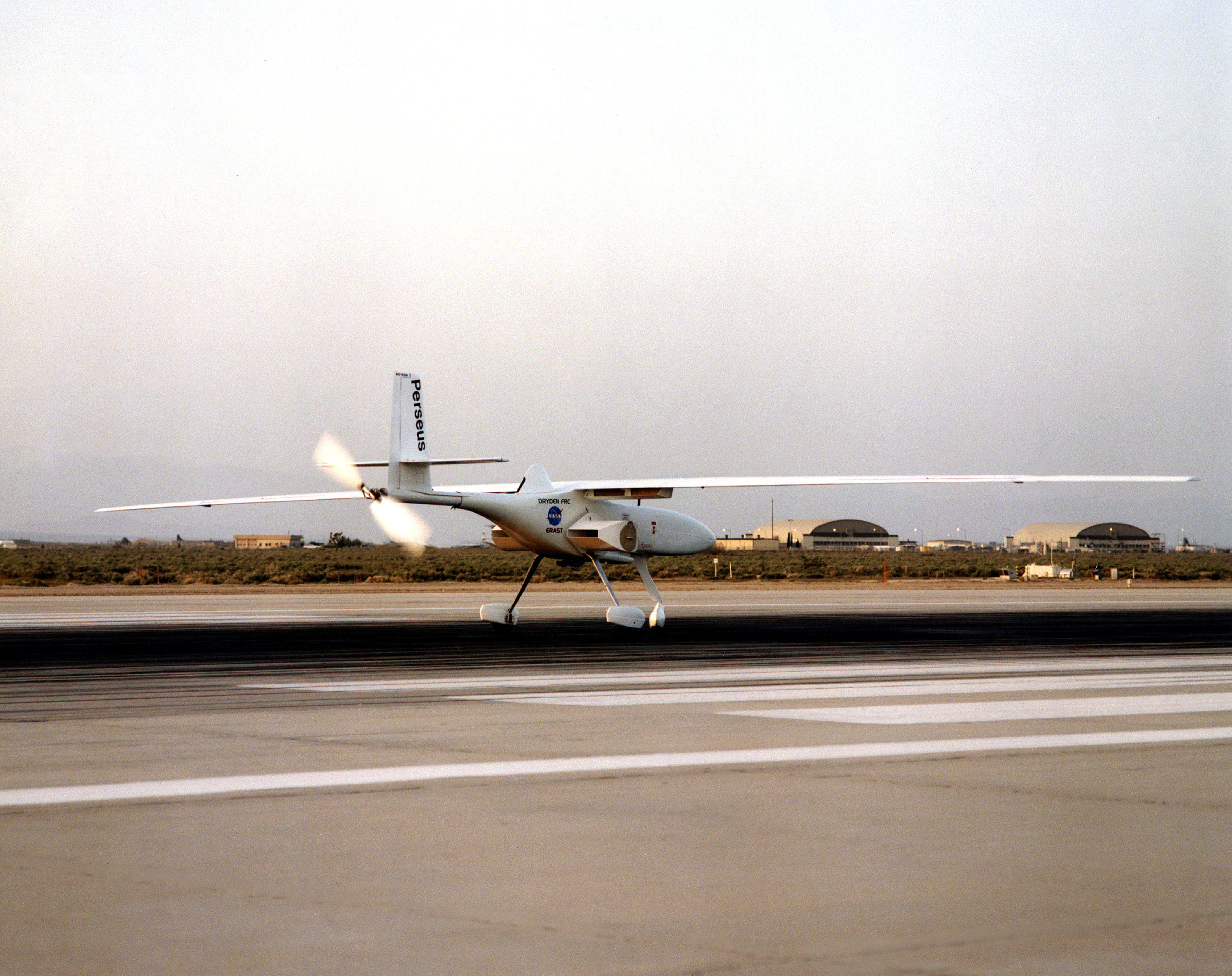The Perseus B remotely piloted aircraft on the runway at Edwards Air Force Base, California at the conclusion of a development flight at NASA's Dryden flight Research Center. The Perseus B is the latest of three versions of the Perseus design developed by Aurora Flight Sciences under NASA's Environmental Research Aircraft and Sensor Technology (ERAST) program.