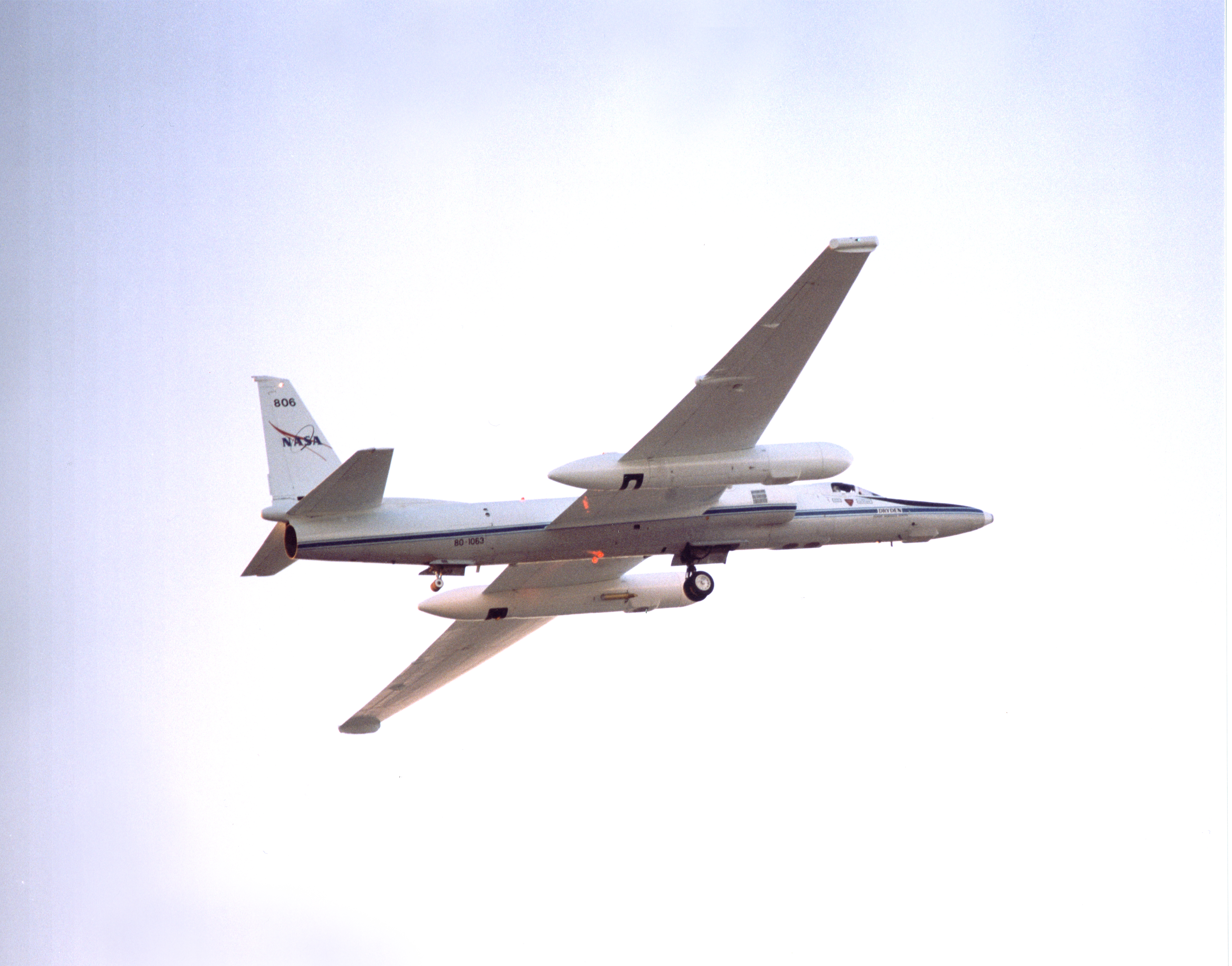 ER-2 tail number 806, is one of two Airborne Science ER-2s used as science platforms by Dryden. The aircraft are platforms for a variety of high-altitude science missions flown over various parts of the world. They are also used for earth science and atmospheric sensor research and development, satellite calibration and data validation. The ER-2s are capable of carrying a maximum payload of 2,600 pounds of experiments in a nose bay, the main equipment bay behind the cockpit, two wing-mounted superpods and small underbody and trailing edges. Most ER-2 missions last about six hours with ranges of about 2,200 nautical miles. The aircraft typically fly at altitudes above 65,000 feet. On November 19, 1998, the ER-2 set a world record for medium weight aircraft reaching an altitude of 68,700 feet. The aircraft is 63 feet long, with a wingspan of 104 feet. The top of the vertical tail is 16 feet above ground when the aircraft is on the bicycle-type landing gear. Cruising speeds are 410 knots, or 467 miles per hour, at altitude. A single General Electric F-118 turbofan engine rated at 17,000 pounds thrust powers the ER-2.