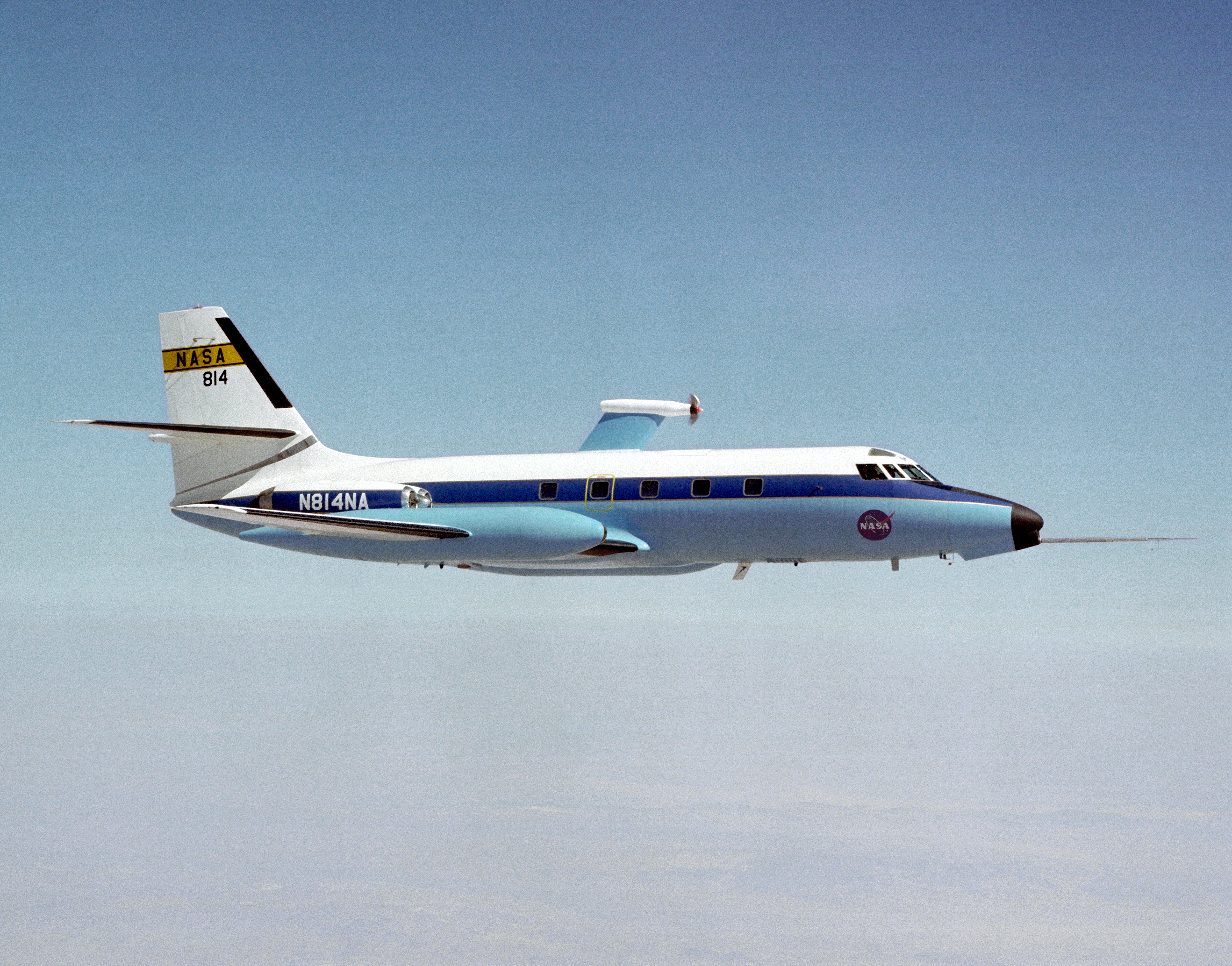 The Dryden C-140 JetStar during testing of advanced propfan designs. Dryden conducted flight research in 1981-1982 on several designs. The technology was developed under the direction of the Lewis Research Center (today the Glenn Research Center, Cleveland, OH) under the Advanced Turboprop Program. Under that program, Langley Research Center in Virginia oversaw work on accoustics and noise reduction. These efforts were intended to develop a high-speed and fuel-efficient turboprop system.