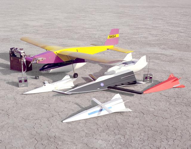 Flight Research Center and Dryden Flight Research Center engineer R. Dale Reed has long used free-flight models to test new concepts. This photo from 1963 shows two different models of the M2-F2 (one under the Mothership) and four Hyper III shapes.