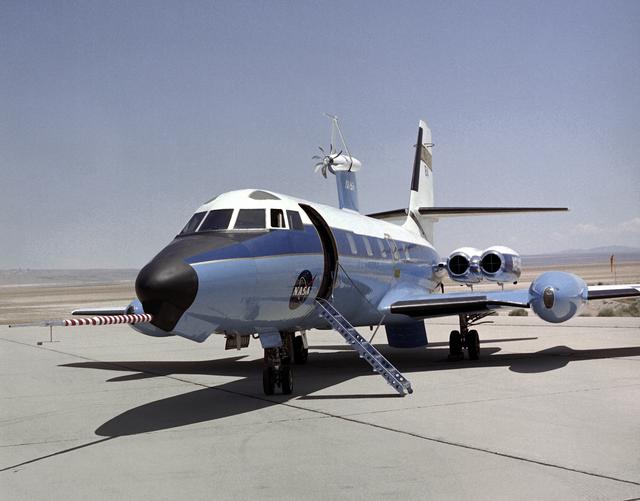In this photo of the C-140 JetStar on the Dryden Ramp, a subscale propeller has been fitted to the upper fuselage of the aircraft.
