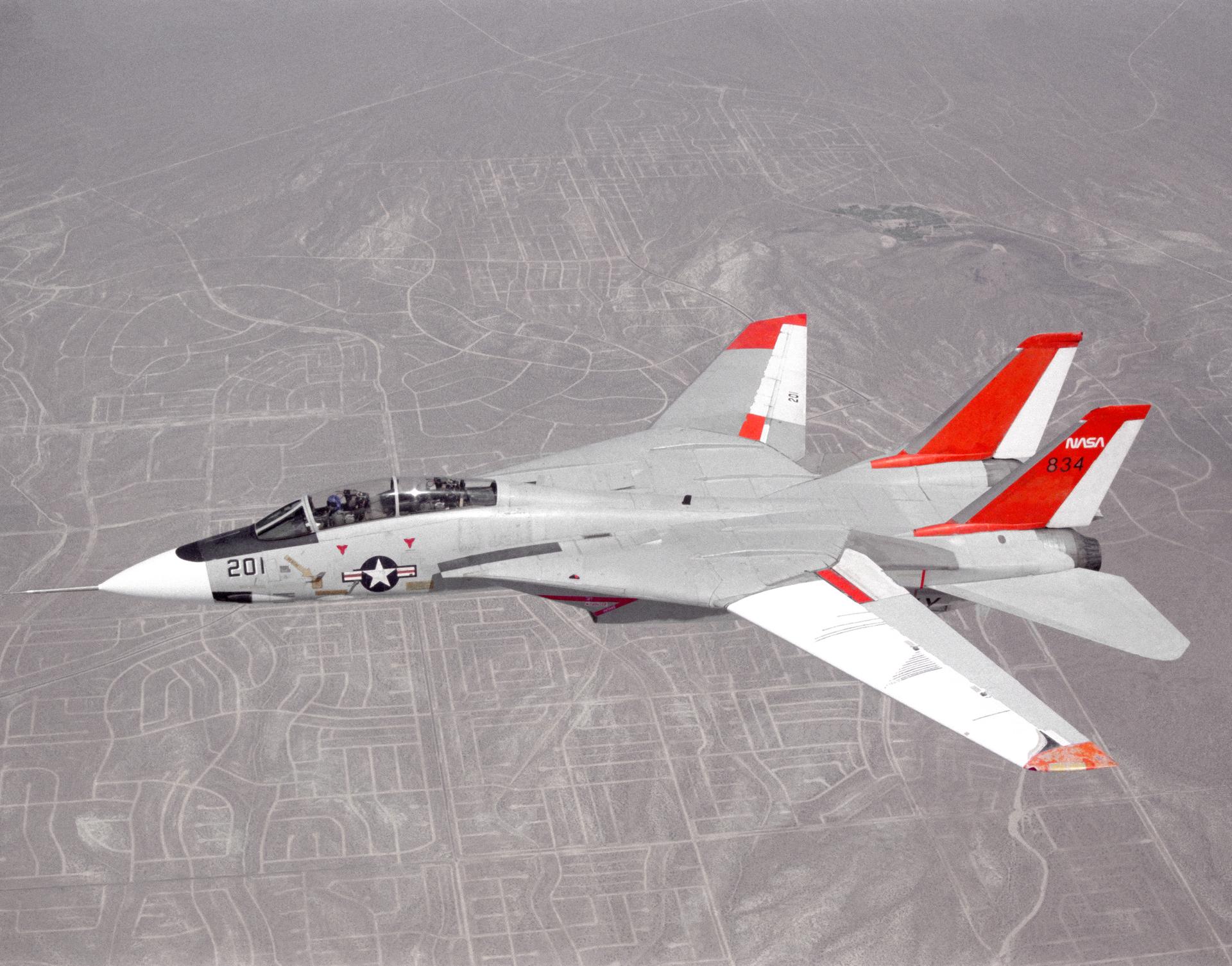 NASA 834, an F-14 Navy Tomcat, seen here in flight, was used at Dryden in 1986 and 1987 in a program known as the Variable-Sweep Transition Flight Experiment (VSTFE). This program explored laminar flow on variable sweep aircraft at high subsonic speeds. An F-14 aircraft was chosen as the carrier vehicle for the VSTFE program primarily because of its variable-sweep capability, Mach and Reynolds number capability, availability, and favorable wing pressure distribution. The variable sweep outer-panels of the F-14 aircraft were modified with natural laminar flow gloves to provide not only smooth surfaces but also airfoils that can produce a wide range of pressure distributions for which transition location can be determined at various flight conditions and sweep angles. Glove I, seen here installed on the upper surface of the left wing, was a "cleanup" or smoothing of the basic F-14 wing, while Glove II was designed to provide specific pressure distributions at Mach 0.7. Laminar flow research continued at Dryden with a research program on the NASA 848 F-16XL, a laminar flow experiment involving a wing-mounted panel with millions of tiny laser cut holes drawing off turbulent boundary layer air with a suction pump.