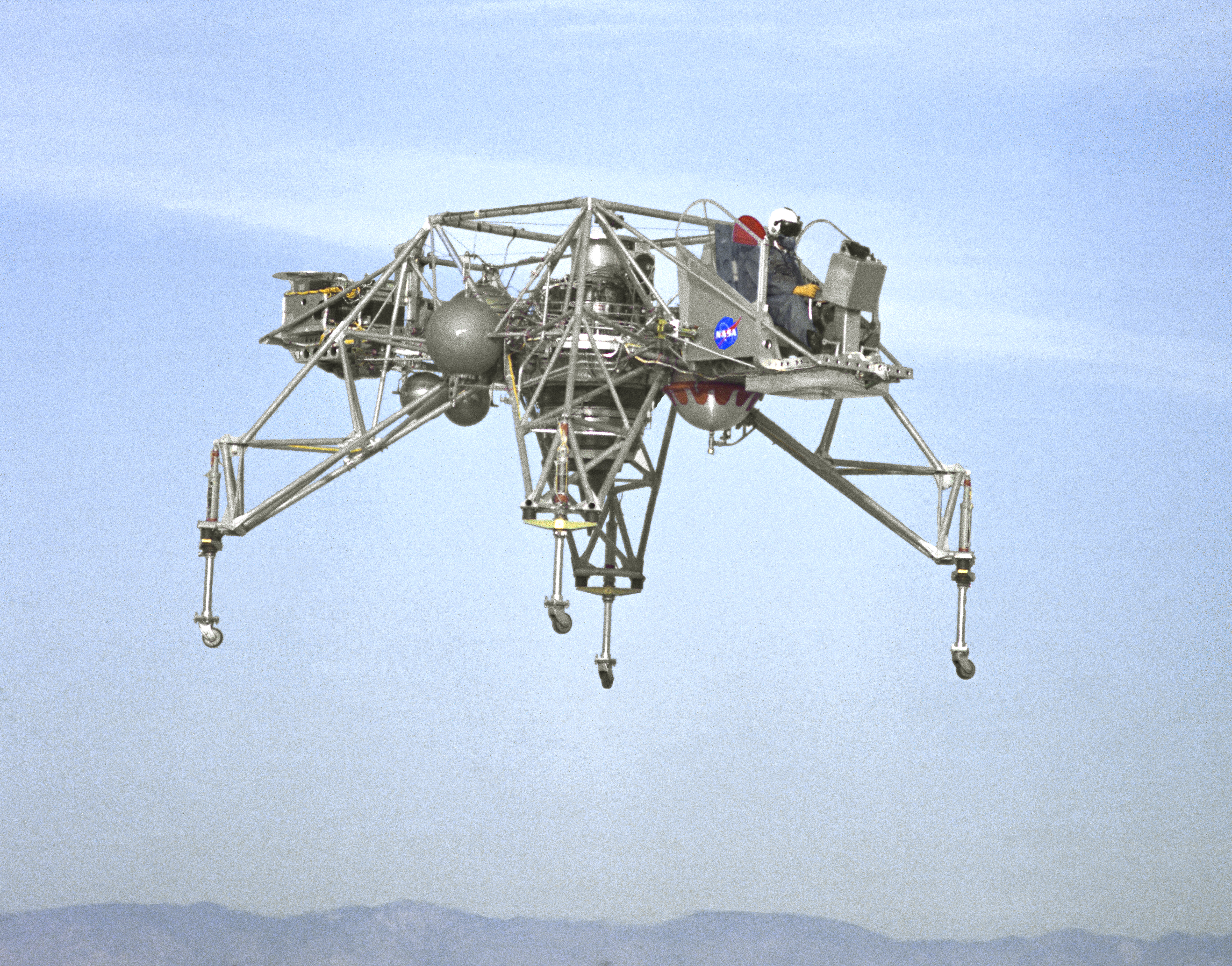 In this NASA Flight Reserch Center photograph the Lunar Landing Research Vehicle (LLRV) number 1 is shown in flight. When Apollo planning was underway in 1960, NASA was looking for a simulator to profile the descent to the Moon's surface. Three concepts surfaced: an electronic simulator, a tethered device, and the ambitious Dryden contribution, a free-flying vehicle. All three became serious projects, but eventually the NASA Flight Research Center's (FRC) Landing Research Vehicle (LLRV) became the most significant one. Hubert M. Drake is credited with originating the idea, while Donald Bellman and Gene Matranga were senior engineers on the project, with Bellman, the project manager. Simultaneously, and independently, Bell Aerosystems Company, Buffalo, N.Y., a company with experience in vertical takeoff and landing (VTOL) aircraft, had conceived a similar free-flying simulator and proposed their concept to NASA headquarters. NASA Headquarters put FRC and Bell together to collaborate. The challenge was; to allow a pilot to make a vertical landing on Earth in a simulated Moon environment, one sixth of the Earth's gravity and with totally transparent aerodynamic forces in a "free flight" vehicle with no tether forces acting on it. Built of tubular aluminum like a giant four-legged bedstead, the vehicle was to simulate a lunar landing profile from around 1500 feet to the Moon's surface. To do this, the LLRV had a General Electric CF-700-2V turbofan engine mounted vertically in gimbals, with 4200 pounds of thrust. The engine, using JP-4 fuel, got the vehicle up to the test altitude and was then throttled back to support five-sixths of the vehicle's weight, simulating the reduced gravity of the Moon. Two hydrogen-peroxide lift rockets with thrust that could be varied from 100 to 500 pounds handled the LLRV's rate of descent and horizontal translations. Sixteen smaller hydrogen-peroxide rockets, mounted in pairs, gave the pilot control in pitch, yaw, and roll. On the LLRV,