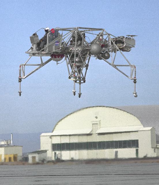 An inflight view from the left side of the Lunar Landing Research Vehicle, is shown in this 1964 NASA Flight Research Center photograph. The photograph was taken in front of the old NACA hangar located at the South Base, Edwards Air Force Base. When Apollo planning was underway in 1960, NASA was looking for a simulator to profile the descent to the Moon's surface. Three concepts surfaced: an electronic simulator, a tethered device, and the ambitious Dryden contribution, a free-flying vehicle. All three became serious projects, but eventually the NASA Flight Research Center's (FRC) Landing Research Vehicle (LLRV) became the most significant one. Hubert M. Drake is credited with originating the idea, while Donald Bellman and Gene Matranga were senior engineers on the project, with Bellman, the project manager. Simultaneously, and independently, Bell Aerosystems Company, Buffalo, N.Y., a company with experience in vertical takeoff and landing (VTOL) aircraft, had conceived a similar free-flying simulator and proposed their concept to NASA headquarters. NASA Headquarters put FRC and Bell together to collaborate. The challenge was; to allow a pilot to make a vertical landing on earth in a simulated Moon environment, one sixth of the earth's gravity and with totally transparent aerodynamic forces in a "free flight" vehicle with no tether forces acting on it. Built of tubular aluminum like a giant four-legged bedstead, the vehicle was to simulate a lunar landing profile from around 1500 feet to the Moon's surface. To do this, the LLRV had a General Electric CF-700-2V turbofan engine mounted vertically in gimbals, with 4200 pounds of thrust. The engine, using JP-4 fuel, got the vehicle up to the test altitude and was then throttled back to support five-sixths of the vehicle's weight, simulating the reduced gravity of the Moon. Two hydrogen-peroxide lift rockets with thrust that could be varied from 100 to 500 pounds handled the LLRV's rate of descent and horizontal transla
