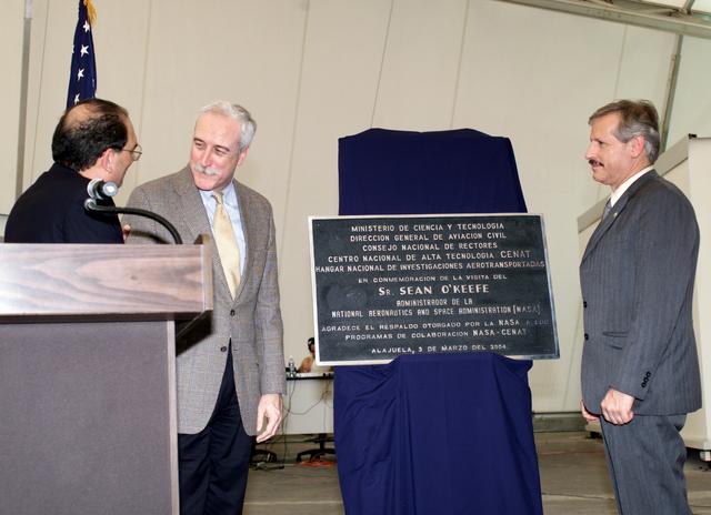 AirSAR 2004 Mesoamerica plaque unveiling by NASA Administrator Sean O'Keefe and Fernando Gutierrez, Costa Rican Minister of Science and Technology(MICIT). AirSAR 2004 Mesoamerica is a three-week expedition by an international team of scientists that will use an all-weather imaging tool, called the Airborne Synthetic Aperture Radar (AirSAR), in a mission ranging from the tropical rain forests of Central America to frigid Antarctica.