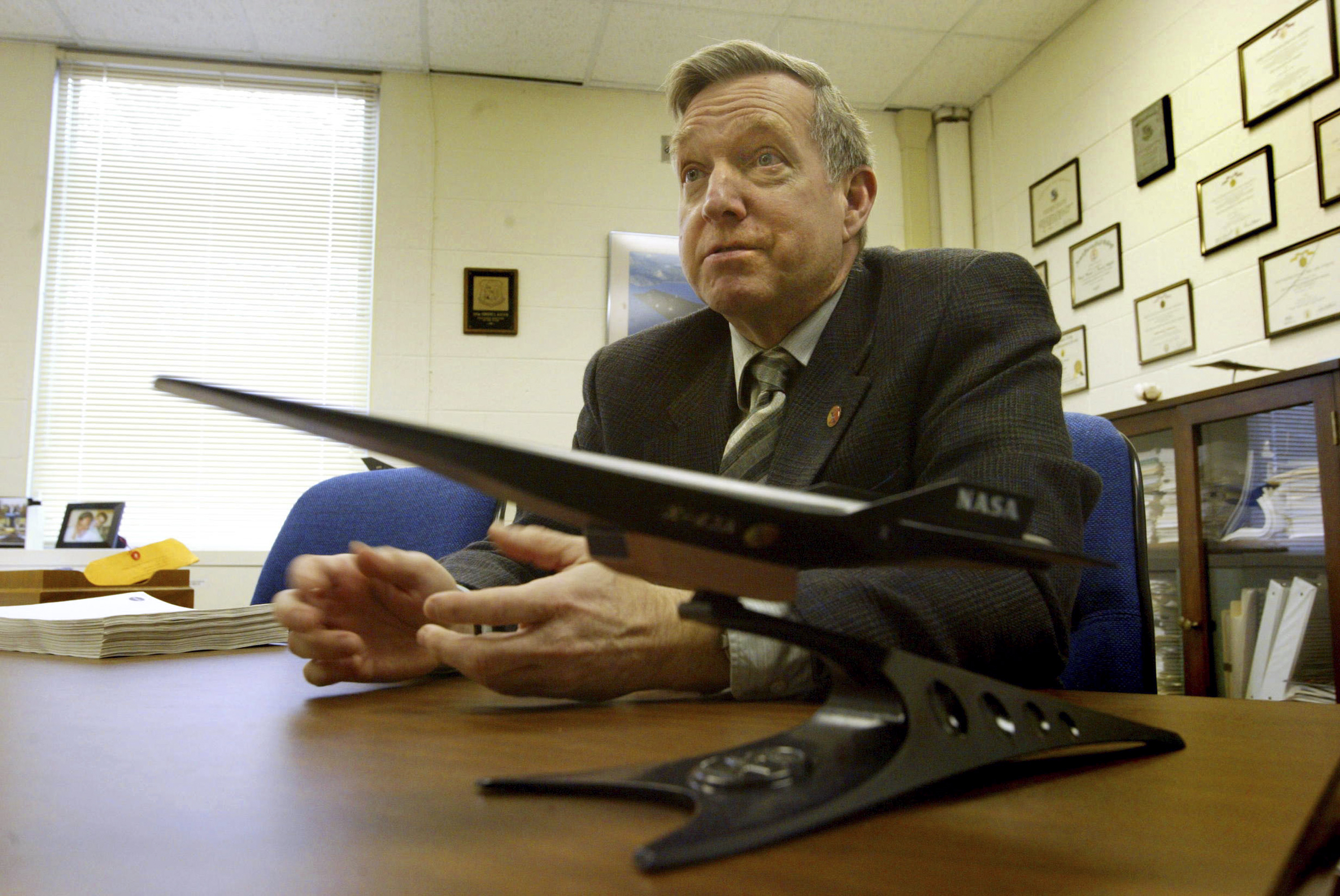 NASA's Hyper-x Program Manager, Vince Rausch talks about the upcoming launch of the X43A vehicle over the Pacific Ocean later this month from his office at NASA Langley Research Center in Hampton, VA. Hyper X is a high risk, high payoff program. The flight of the X43 A will demonstrated in flight for the first time, air breathing hypersonic propulsion technology. (Photo by Jeff Caplan)