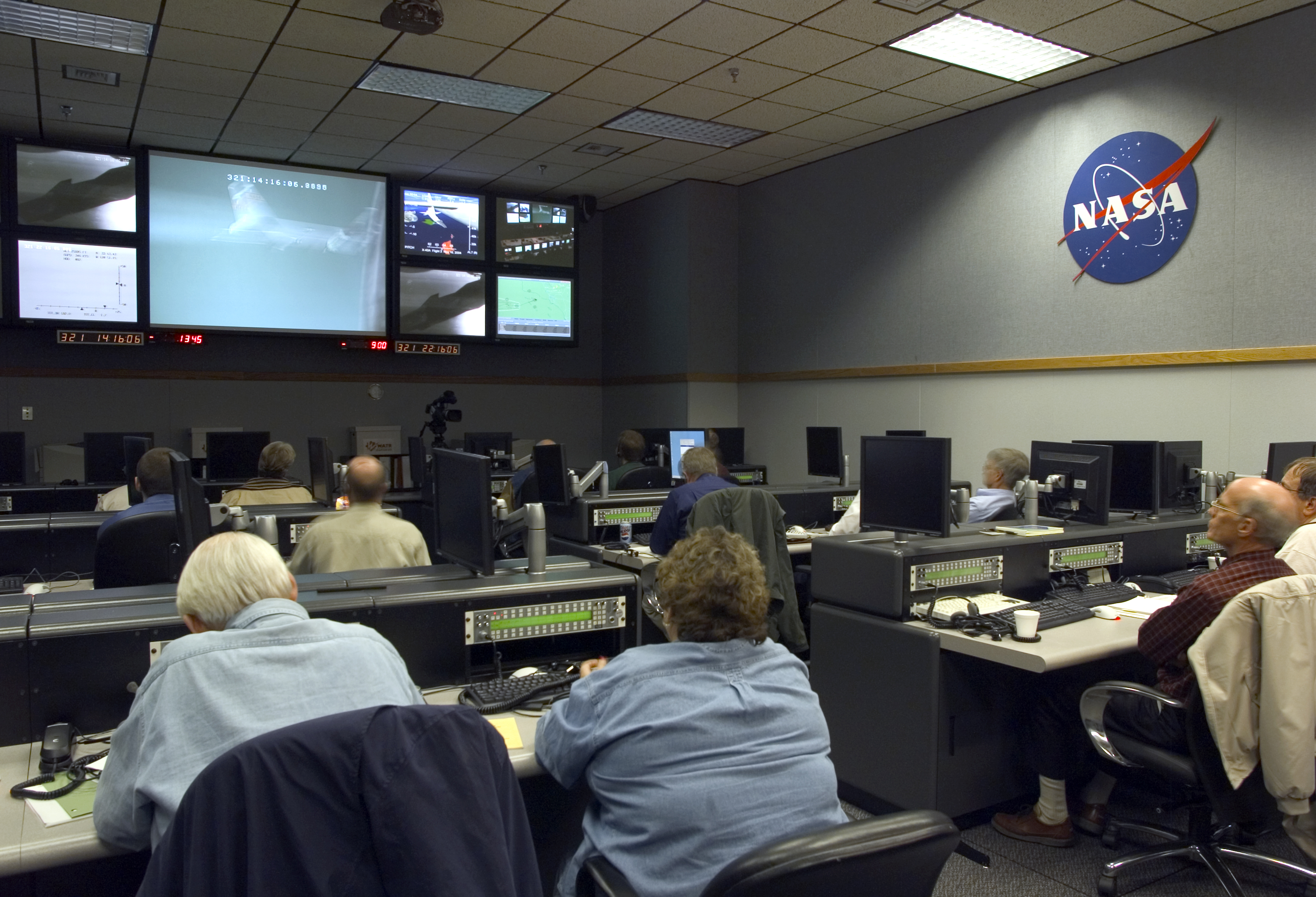 NASA engineers monitor mission progress from a Dryden control room prior to launch of the X-43A scramjet and its booster from NASA's B-52B mothership.
