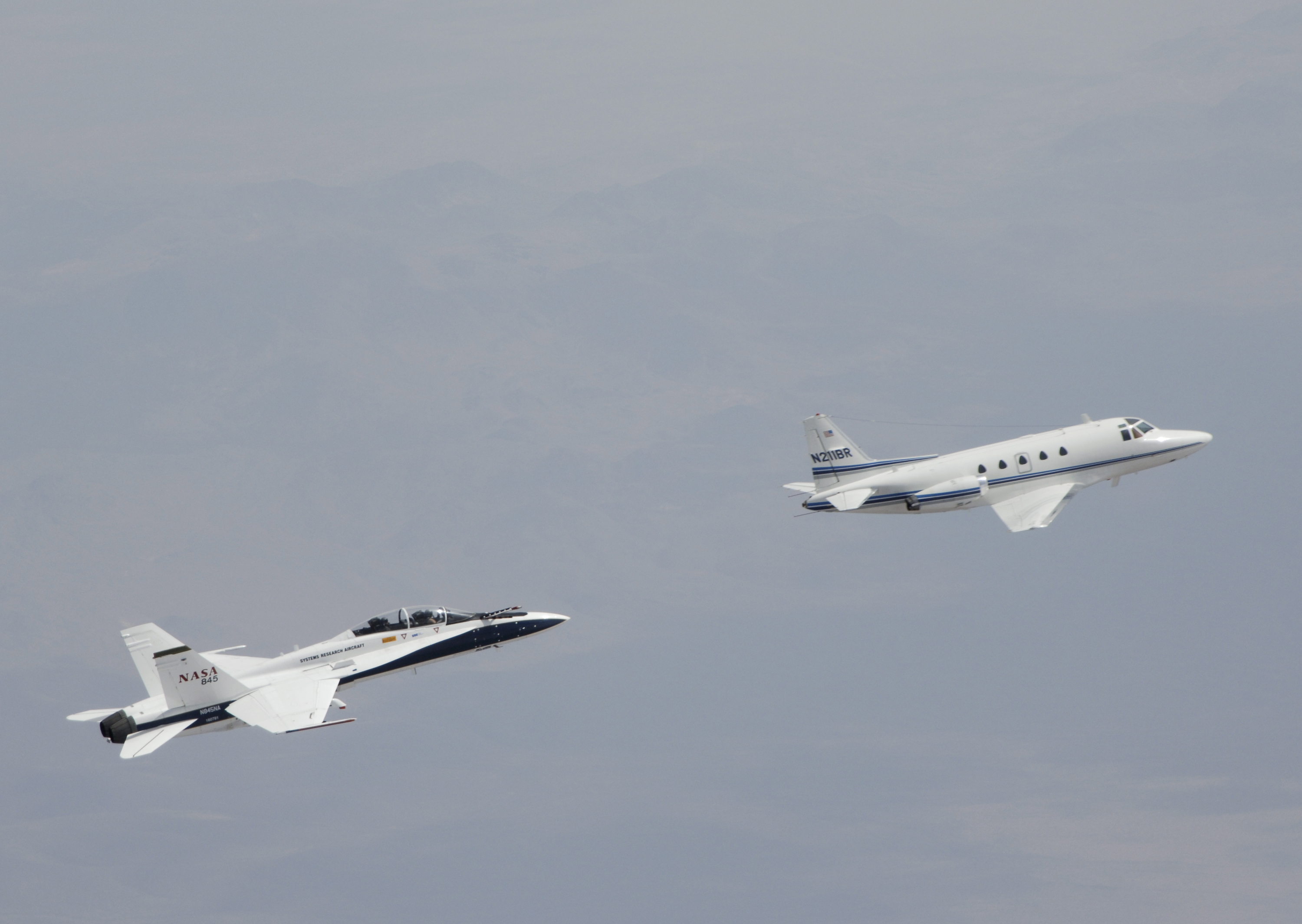Testing autonomous software for AARD program using a NASA F/A-18 #845 following a chartered Sabreliner.
