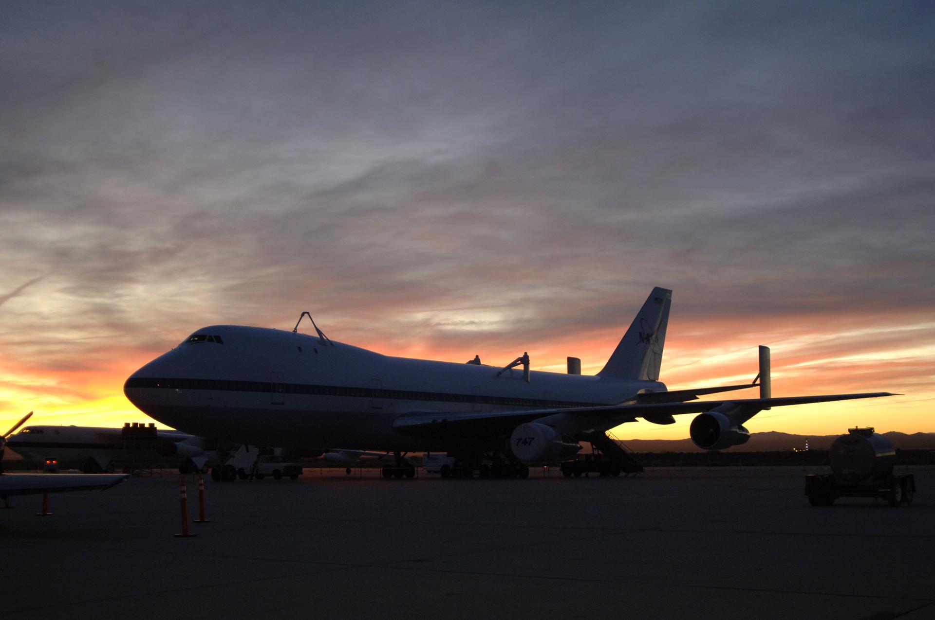 One of NASA's two modified Boeing 747 Shuttle Carrier Aircraft is silhouetted against the morning sky at sunrise on the ramp at Edwards Air Force Base.