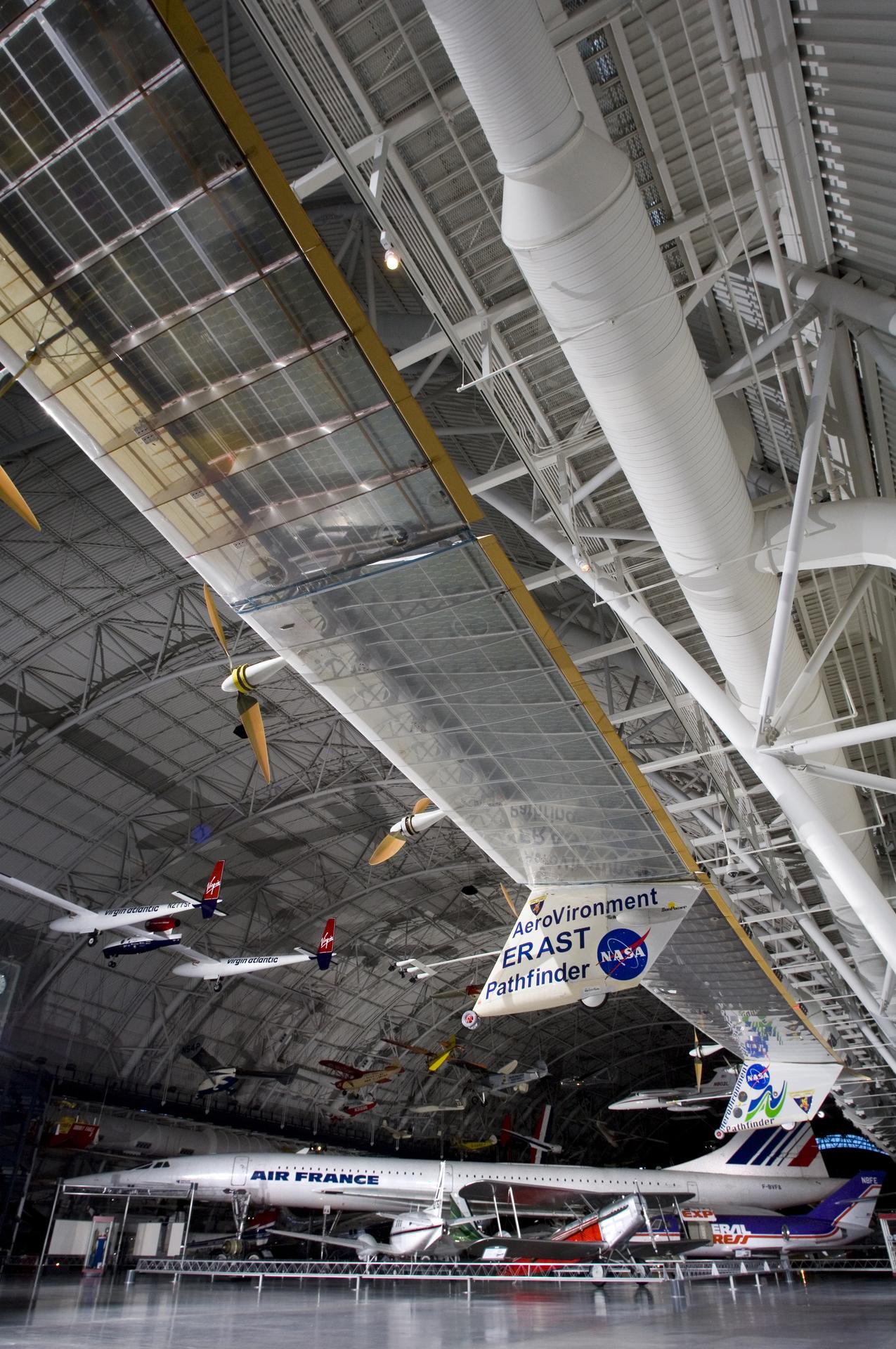 The record-setting AeroVironment/NASA Pathfinder-Plus solar-electric flying wing is enshrined in the National Air & Space Museum's Udvar-Hazy Center in Virginia.