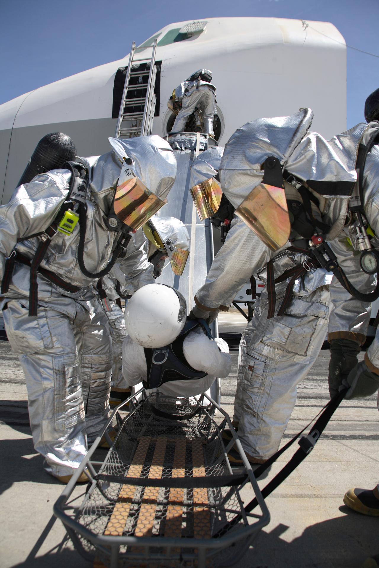 Clad in thermal protection suits, fire/rescue crew aid a volunteer "Injured astronaut" to a head-first ride down the exit slide from the shuttle cabin mockup