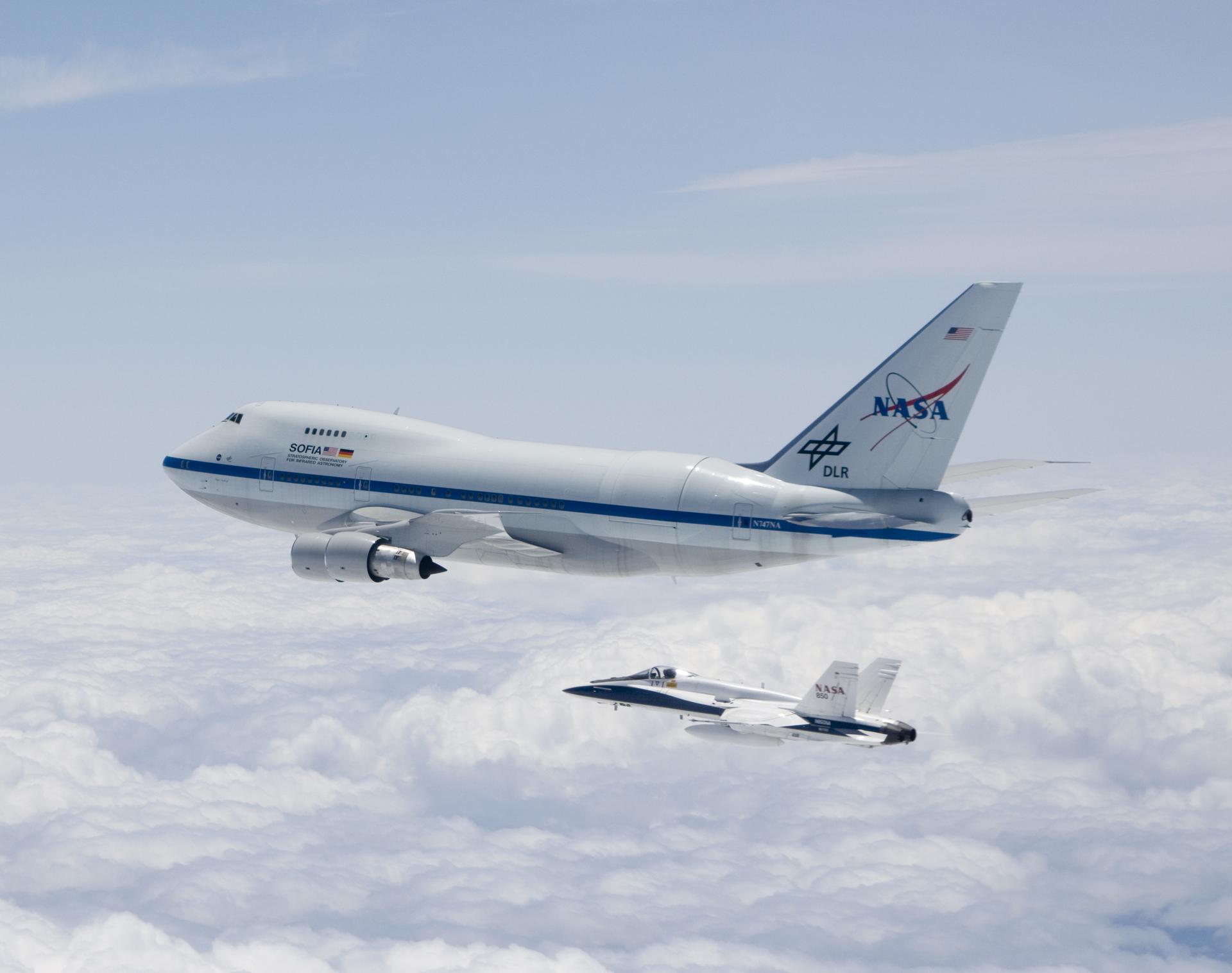NASA's SOFIA airborne observatory is shadowed by a NASA F/A-18 safety chase aircraft during its second checkout flight near Waco, Texas on May 10, 2007.