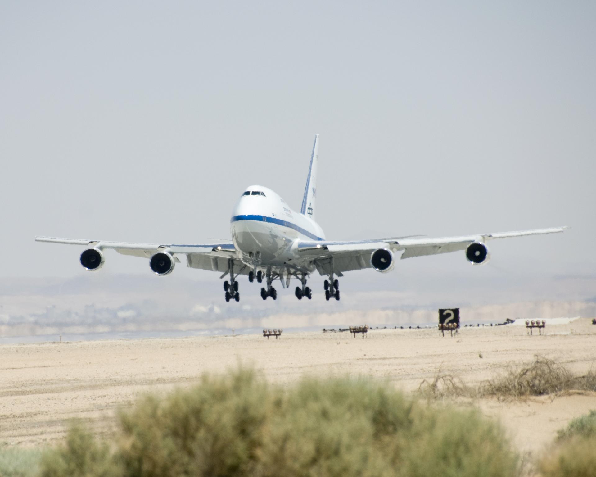NASA's Stratospheric Observatory for Infrared Astronomy (SOFIA) Boeing 747SP flares for landing at Edwards AFB after a ferry flight from Waco, Texas. NASA's Stratospheric Observatory for Infrared Astronomy, or SOFIA, arrived at NASA's Dryden Flight Research Center at Edwards Air Force Base, Calif. on May 31, 2007. The heavily modified Boeing 747SP was ferried to Dryden from Waco, Texas, where L-3 Communications Integrated Systems installed a German-built 2.5-meter infrared telescope and made other major modifications over the past several years. SOFIA is scheduled to undergo installation and integration of mission systems and a multi-phase flight test program at Dryden over the next three years that is expected to lead to a full operational capability to conduct astronomy missions in about 2010. During its expected 20-year lifetime, SOFIA will be capable of "Great Observatory" class astronomical science, providing astronomers with access to the visible, infrared and sub-millimeter spectrum with optimized performance in the mid-infrared to sub-millimeter range.