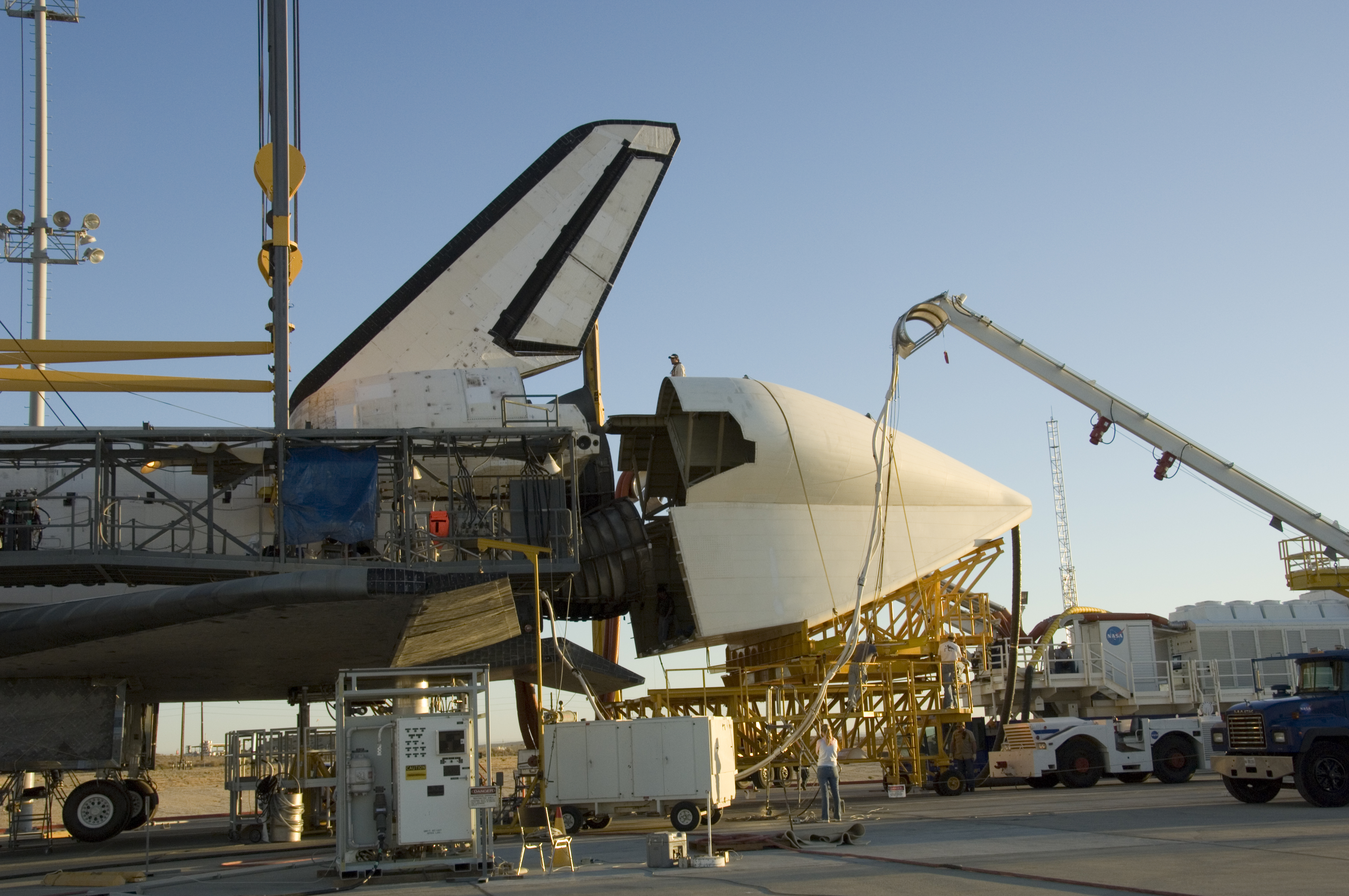 Technicians attach the tail cone, which helps reduce aerodynamic drag and turbulence during its ferry flight, to the Space Shuttle Atlantis in preparation for its return to NASA's Kennedy Space Center in Florida. After the tail-cone is installed, Discovery will be mounted on NASA's modified Boeing 747 Shuttle Carrier Aircraft, or SCA, for the return flight.