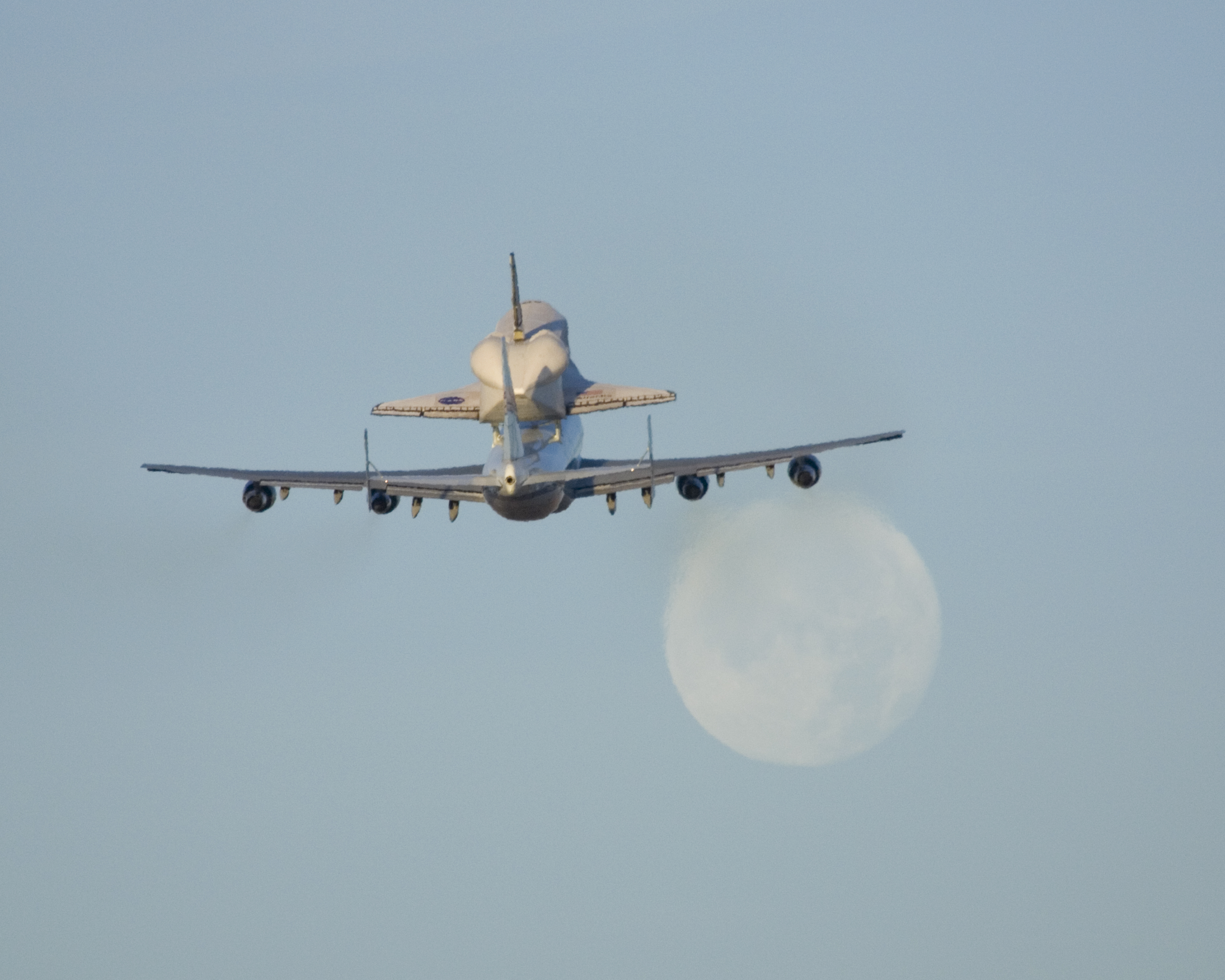 NASA's modified Boeing 747 Shuttle Carrier Aircraft with the Space Shuttle Atlantis on top lifts off from Edwards Air Force Base to begin its ferry flight back to the Kennedy Space Center in Florida. The cross-country journey will take approximately two days, with stops at several intermediate points for refueling.