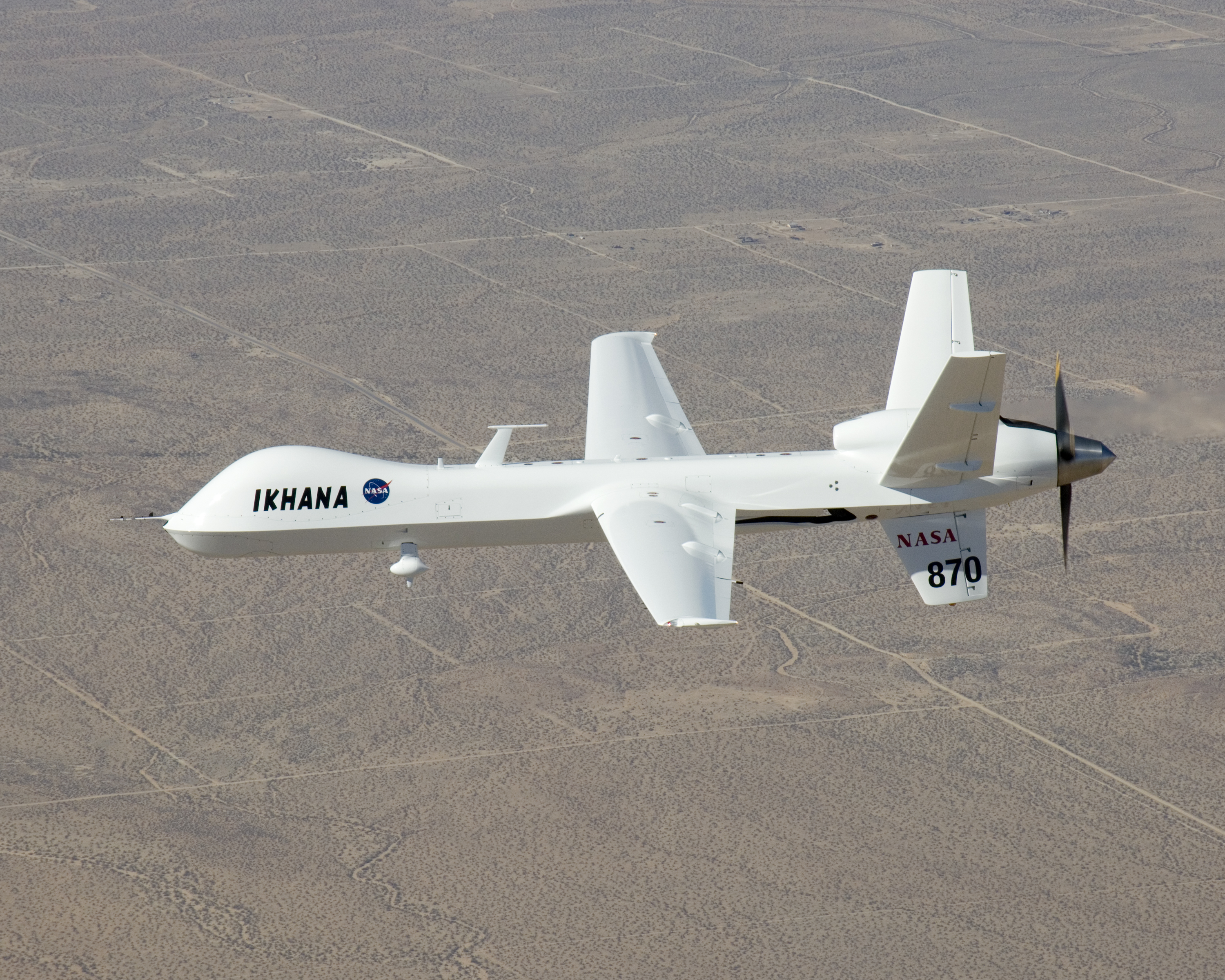 NASA's Ikhana unmanned science demonstration aircraft over Southern California's high desert during the ferry flight to its new home at the Dryden Flight Research Center. NASA took possession of the new aircraft in November, 2006, and it arrived at DFRC at Edwards Air Force Base, Calif., on June 23, 2007.