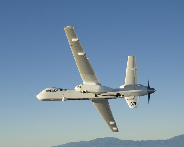 Carrying its sensor pod, NASA's remotely piloted Ikhana unmanned aircraft banks away during a checkout flight in the Western States Fire Mission.