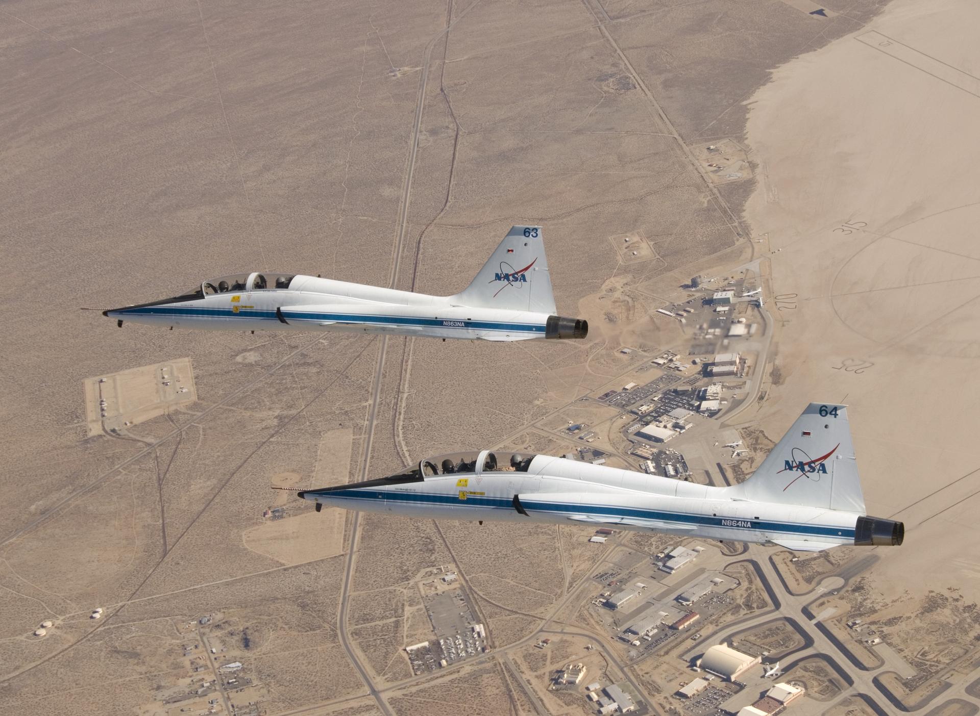 NASA Dryden's two T-38A mission support aircraft fly in tight formation while conducting a pitot-static airspeed calibration check near Edwards Air Force Base