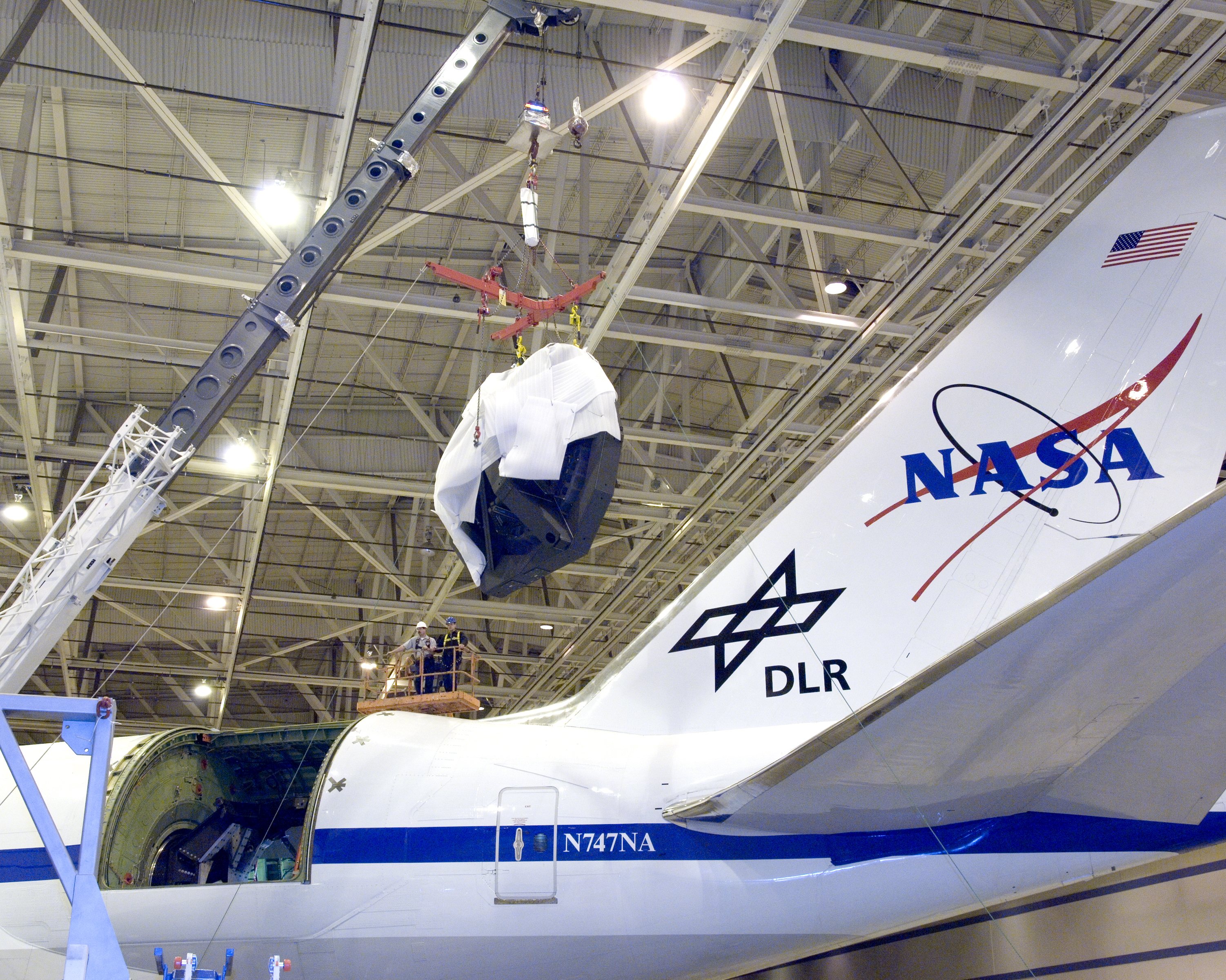 Technicians at the NASA Dryden Aircraft Operations Facility in Palmdale, Calif., removed the German-built primary mirror assembly from the Stratospheric Observatory for Infrared Astronomy, or SOFIA, April 18, 2008 in preparation for the final finish coating of the mirror. A precision crane lifted the more than two-ton mirror assembly from its cavity in the rear fuselage of the highly modified Boeing 747SP. The assembly was then secured in its transport dolly and moved to a clean room where it was prepared for shipment to NASA Ames Research Center at Moffett Field near Mountain View, Calif. where it would receive its aluminized finish coating before being re-installed in the SOFIA aircraft.