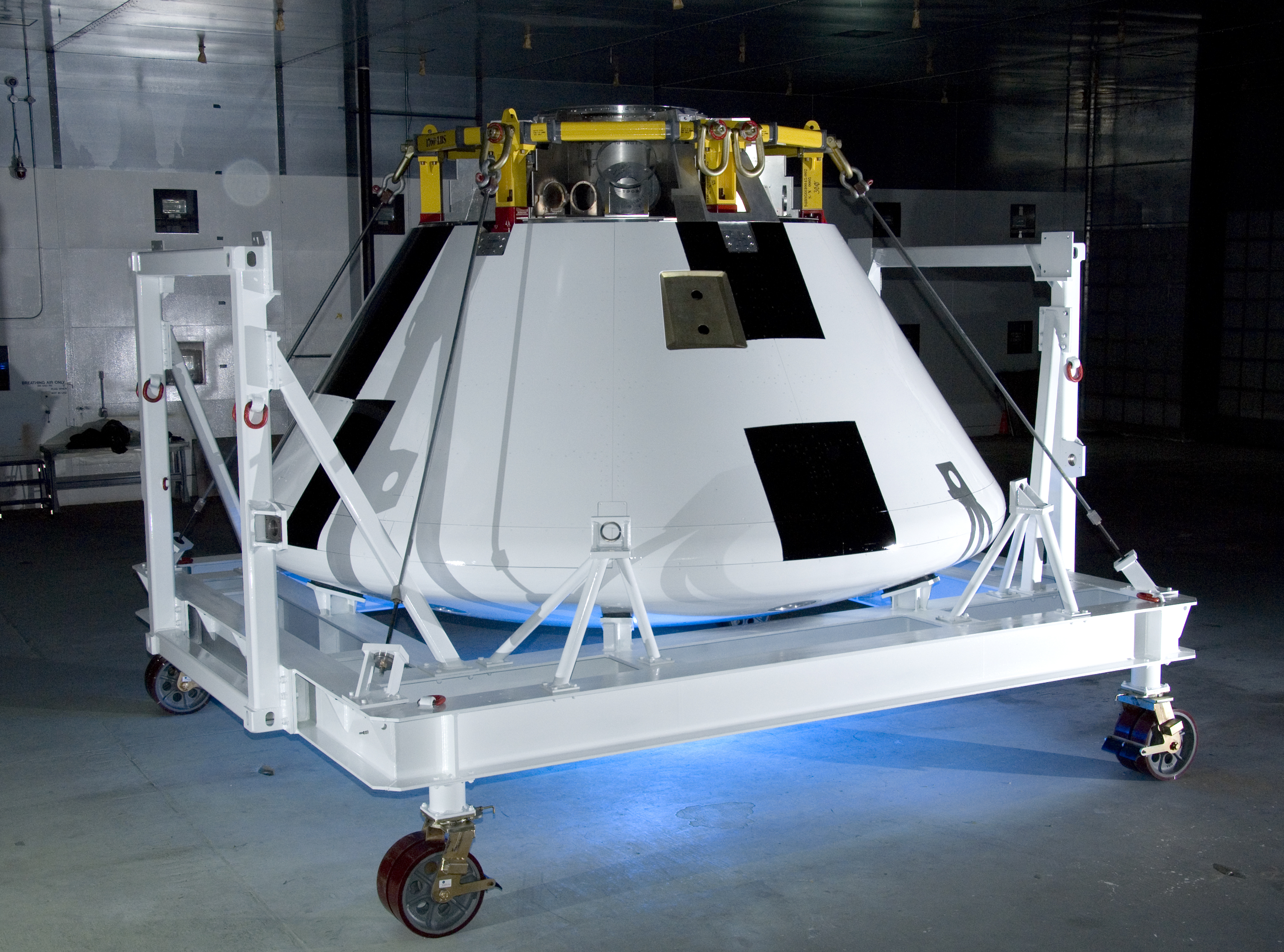 A full-scale flight-test mockup of the Constellation program's Orion crew vehicle arrived at NASA's Dryden Flight Research Center in late March 2008 to undergo preparations for the first short-range flight test of the spacecraft's astronaut escape system later that year. Engineers and technicians at NASA's Langley Research Center fabricated the structure, which precisely represents the size, outer shape and mass characteristics of the Orion space capsule. The Orion crew module mockup was ferried to NASA Dryden on an Air Force C-17. After painting in the Edwards Air Force Base paint hangar, the conical capsule was taken to Dryden for installation of flight computers, instrumentation and other electronics prior to being sent to the U.S. Army's White Sands Missile Range in New Mexico for integration with the escape system and the first abort flight test in late 2008. The tests were designed to ensure a safe, reliable method of escape for astronauts in case of an emergency.