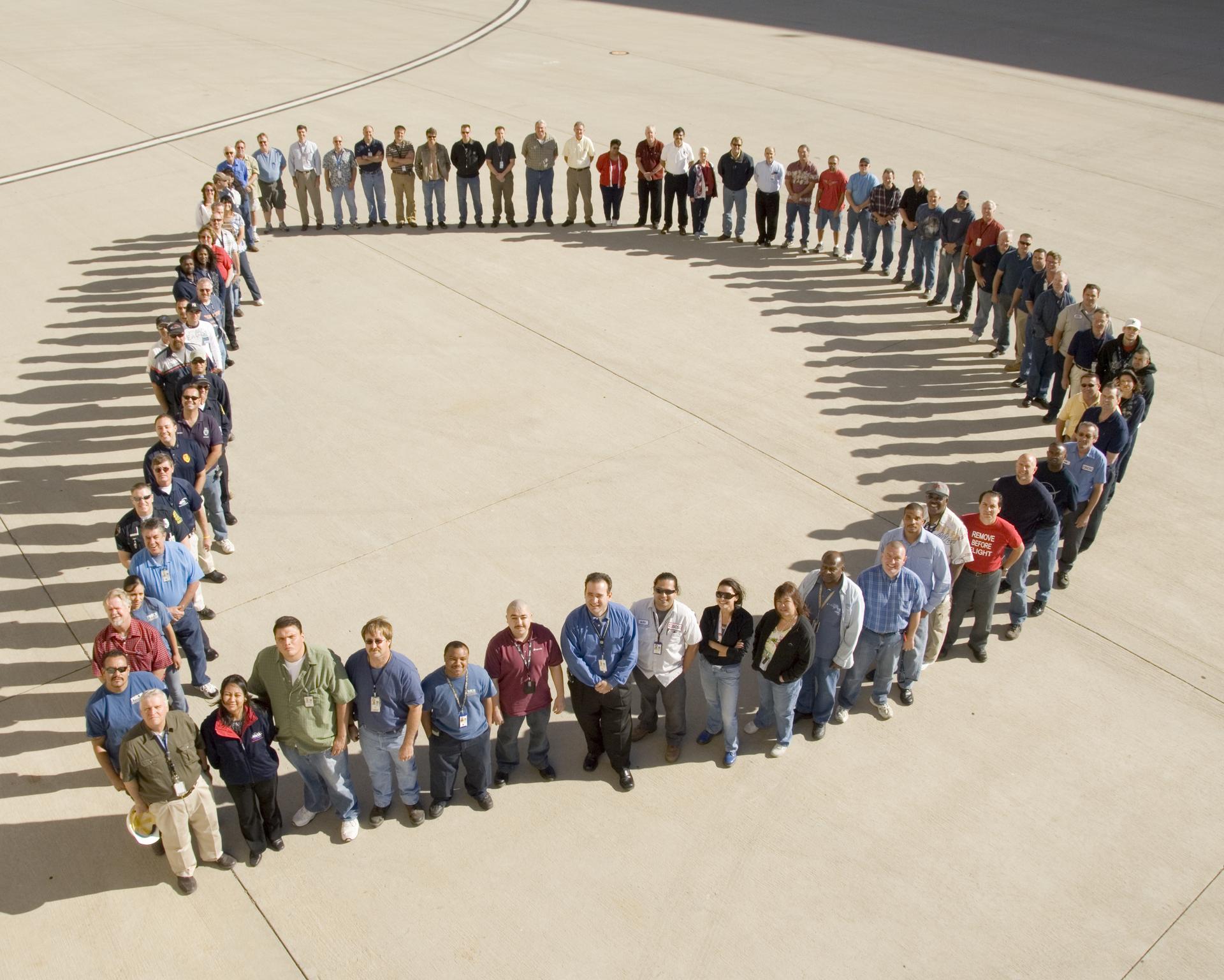 To support NASA's 50th Anniversary, NASA government and contractor employees gathered to form a giant "D" outside the Dryden Aircraft Operations Facility
