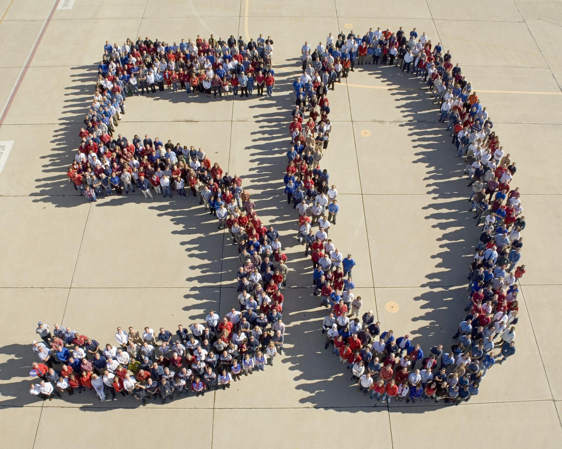 In support of NASA's 50th Anniversary, hundreds of NASA government and contractor employees dressed in red, white, and blue gathered to form a giant "50" on the back ramp at NASA's Dryden Flight Research Center.