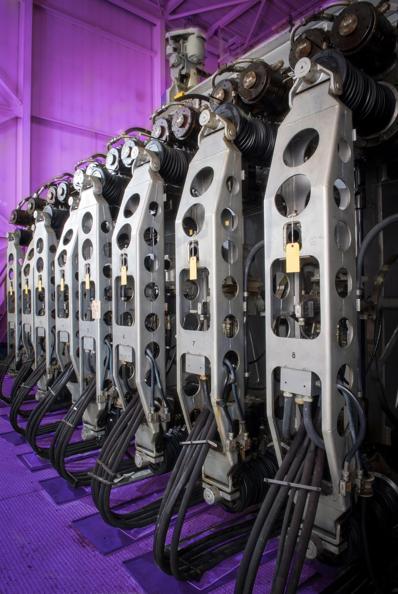 The flexwall section of NASA Glenn’s 10x10 supersonic wind tunnel is made up of two movable flexible steel sidewalls. These powerful hydraulic jacks move the walls in and out to control supersonic air speeds in the test section between Mach 2.0 and 3.5.