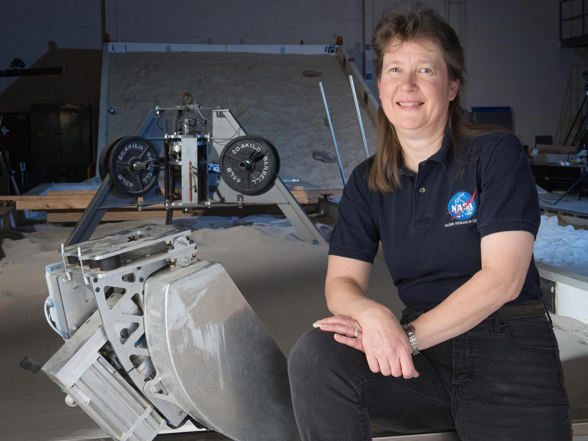 Diane Linne in the Simulated Lunar Operations, SLOPE Lab - Percussive Excavation Bucket reduces reaction forces for extraterrestrial digging of loose and compacted or icy soils.