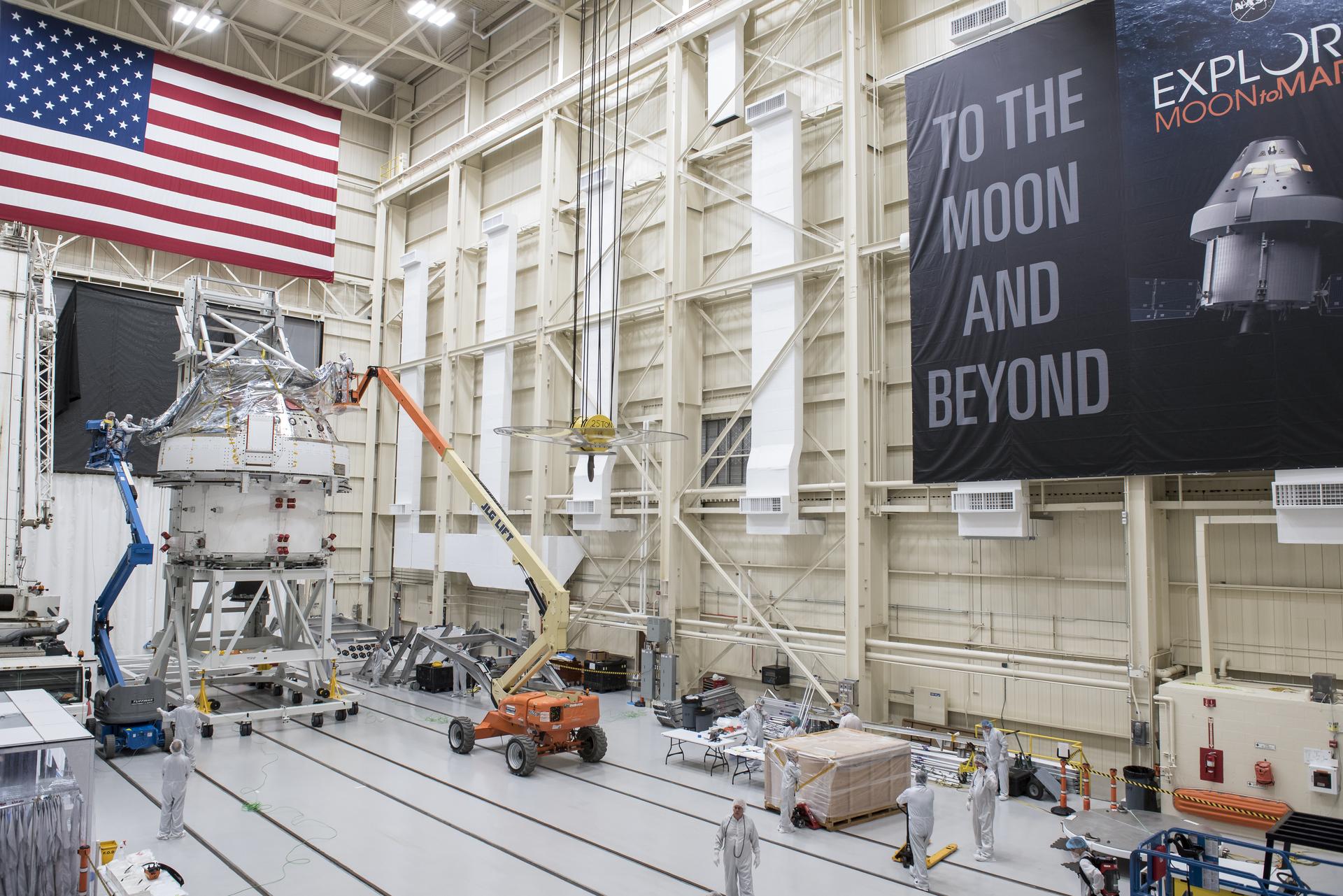 Orion Spacecraft is prepared for Space Environment Testing at the Glenn Research Center, GRC Plum Brook Station, Space Environments Complex, SEC