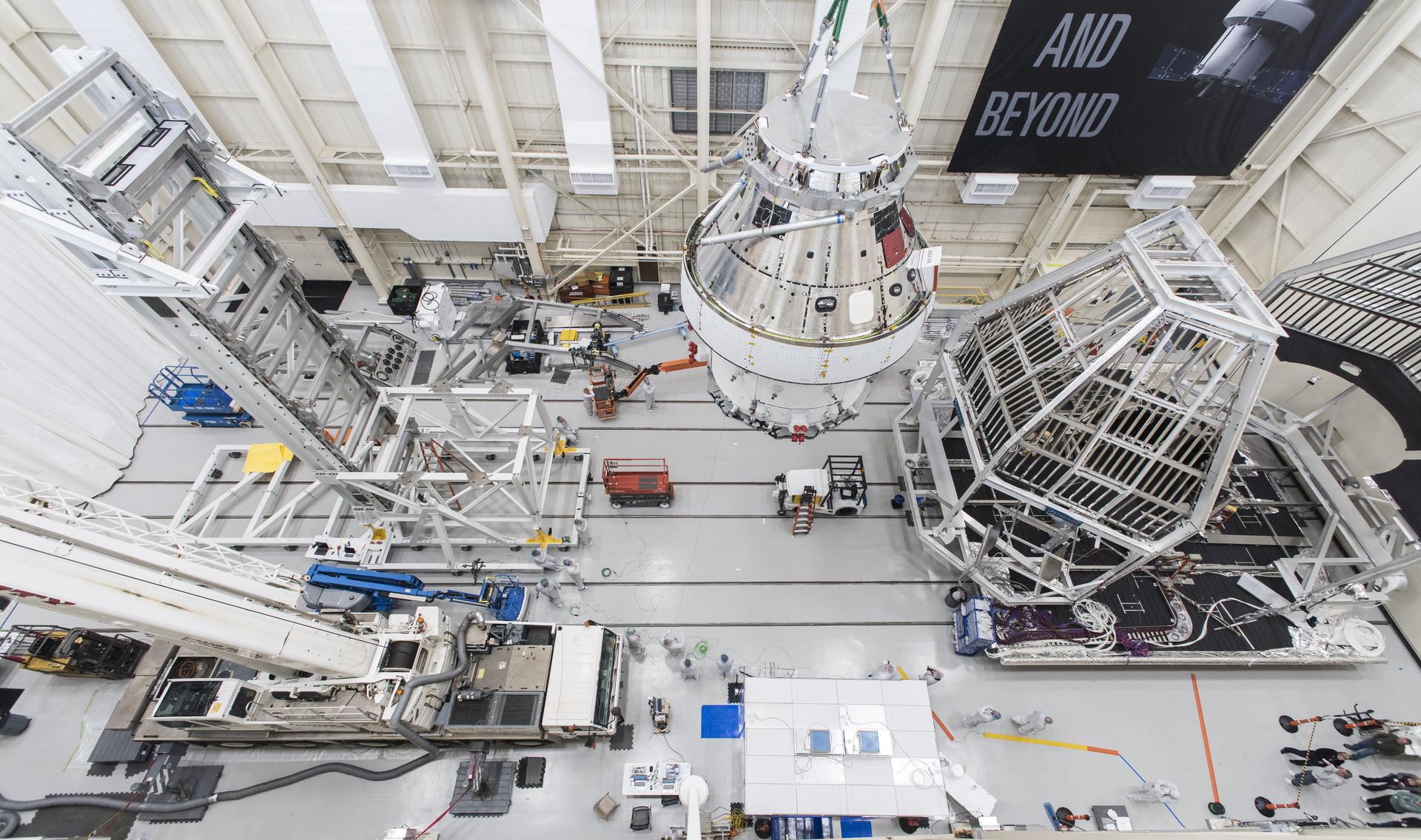 Orion Spacecraft is prepared for Space Environment Testing at the Glenn Research Center, GRC Plum Brook Station, Space Environments Complex, SEC