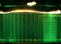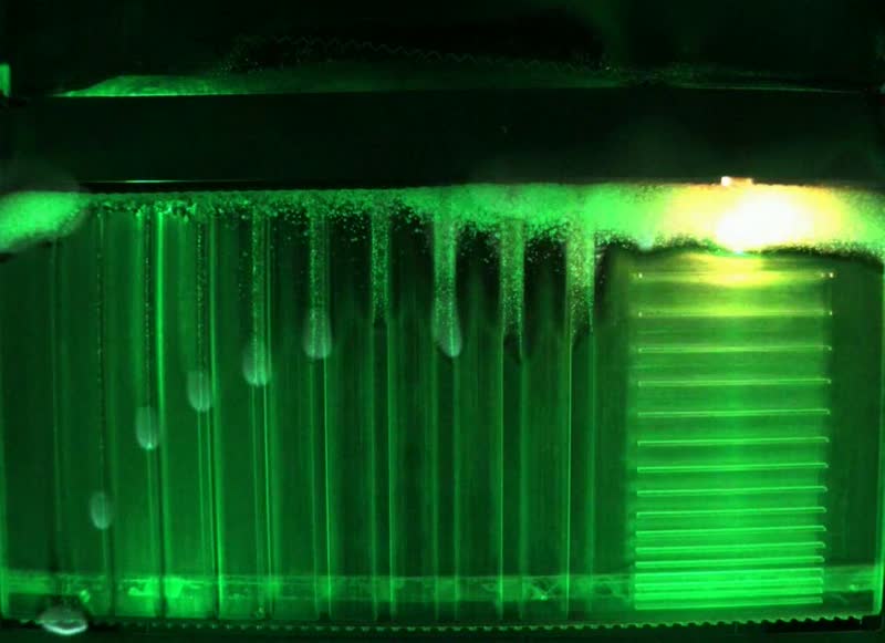 A sample of polymethyl methacrylate, also known as Plexiglas, was burned in the Saffire-V experiment. Ribs were manufactured into the material to see how the flame behaved when small structures were incorporated into larger materials. Researchers discovered that fires in microgravity typically grow and burn faster on the thinner ribs and materials as opposed to thicker samples on the right.