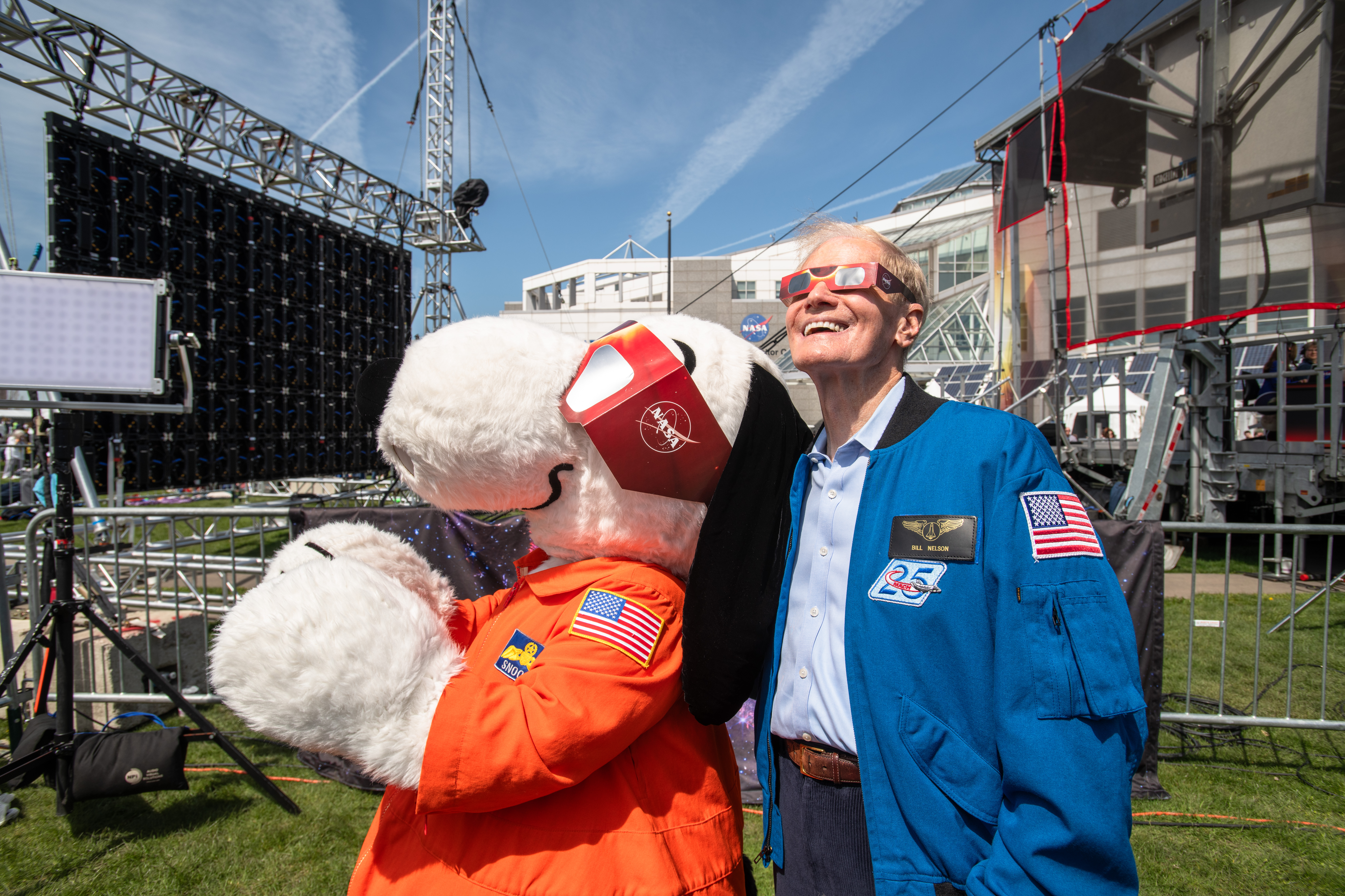 Administrator Bill Nelson and Snoopy view the eclipse together on April 8, 2024. NASA Glenn Research Center and the Great Lakes Science Center hosted a three-day celestial celebration in downtown Cleveland, OH. This free, outdoor, family-friendly science and arts festival will feature free concerts, performances, speakers, and hands-on science activities with community partners. A total solar eclipse swept across a narrow portion of the North American continent from Mexico’s Pacific coast to the Atlantic coast of Newfoundland, Canada. A partial solar eclipse was visible across the entire North American continent along with parts of Central America and Europe. Photo Credit: (NASA/Sara Lowthian-Hanna)