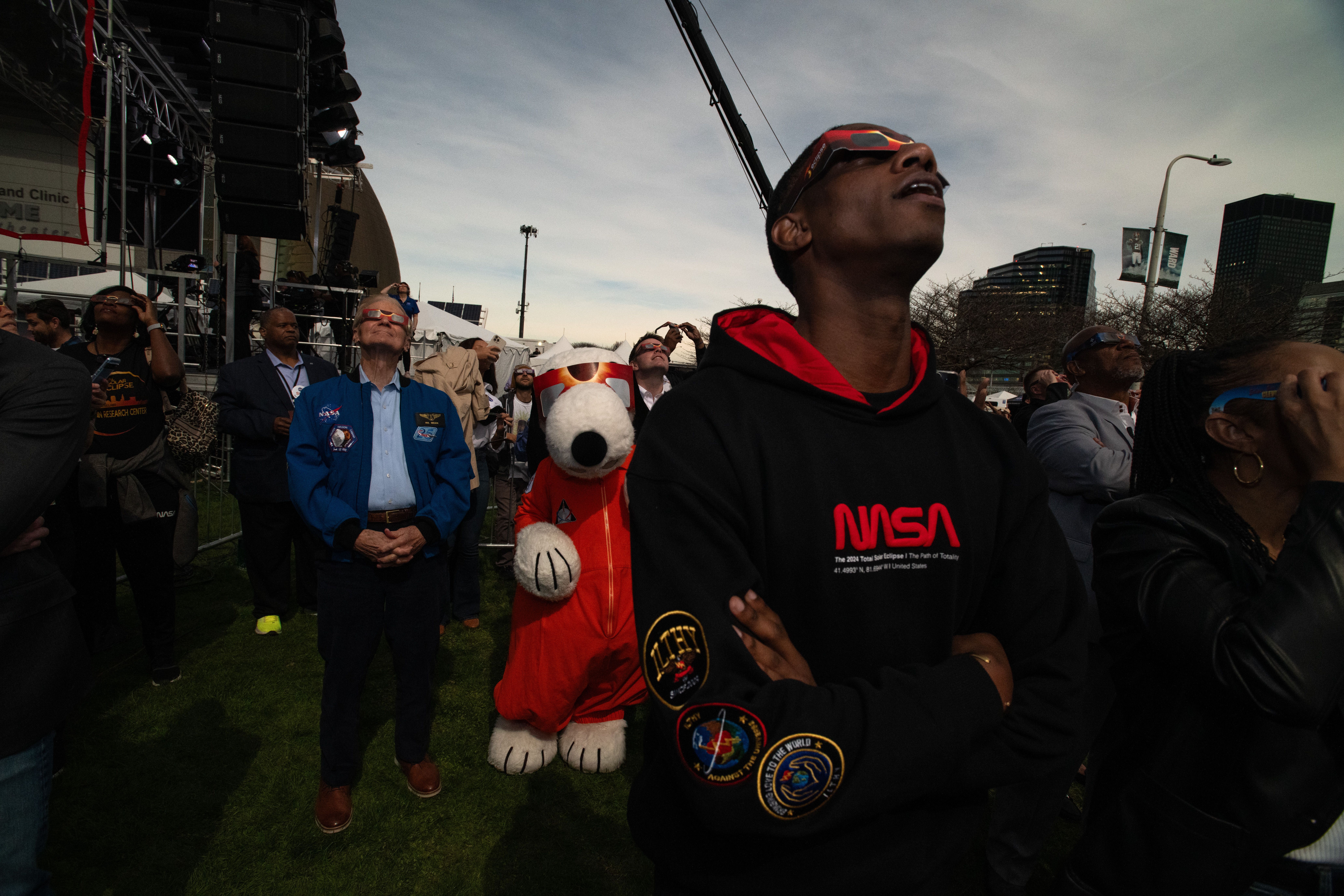Administrator Bill Nelson, Snoopy and Cleveland Mayor Justin Bibb view the eclipse just before totality. NASA Glenn Research Center and the Great Lakes Science Center hosted a three-day celestial celebration in downtown Cleveland, OH. This free, outdoor, family-friendly science and arts festival will feature free concerts, performances, speakers, and hands-on science activities with community partners. A total solar eclipse swept across a narrow portion of the North American continent from Mexico’s Pacific coast to the Atlantic coast of Newfoundland, Canada. A partial solar eclipse was visible across the entire North American continent along with parts of Central America and Europe.